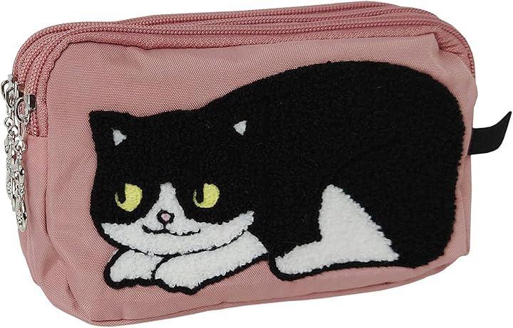 ふわふわ生地の可愛いネコに癒される3つのポケットがついた可愛くて機能的なポーチ。