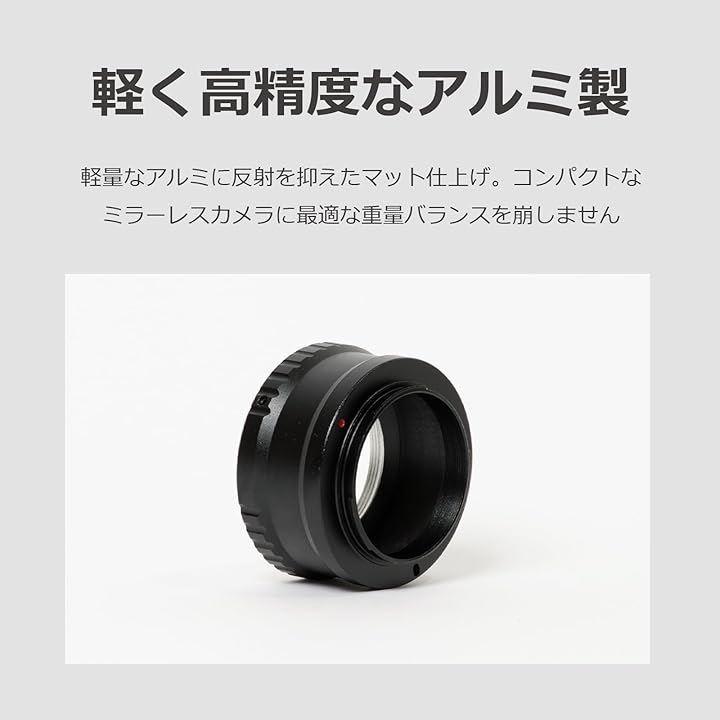 「製品仕様」「素材」アルミ合金 「対応レンズマウント」M42 「対応カメラ」αEマウントを持つソニー製ミラーレスカメラ「高さ」27.5mm(マウント部の突起を除く)「胴直径」細い部分56mm太い部分59mm「重量」58g *レンズなしレリーズをONにして使用してください。