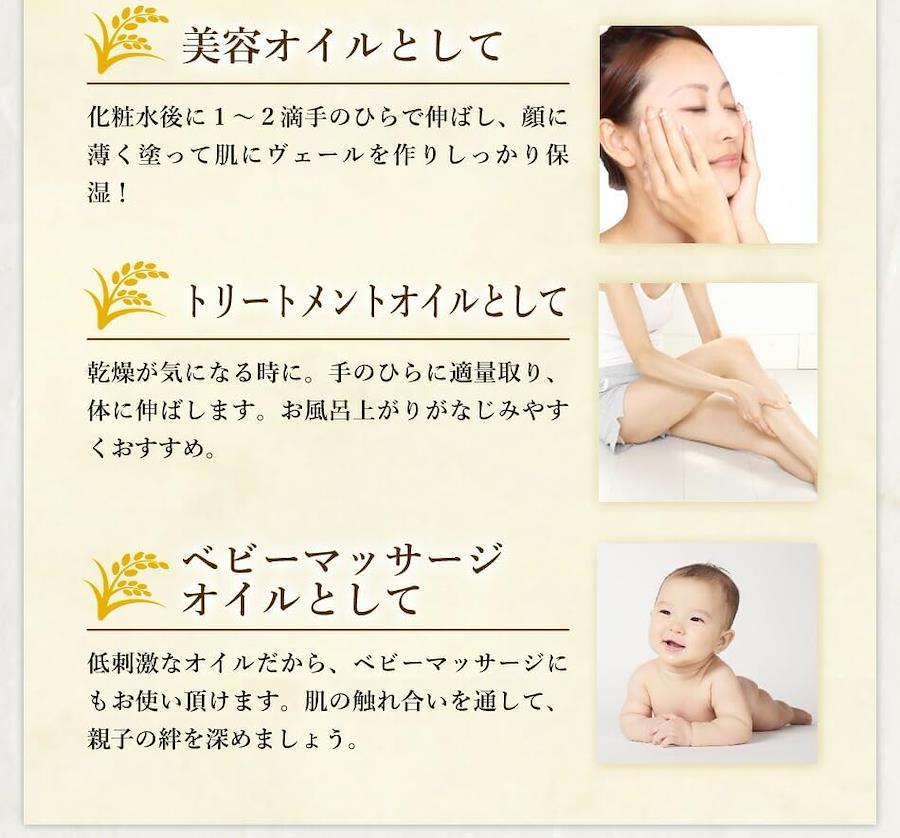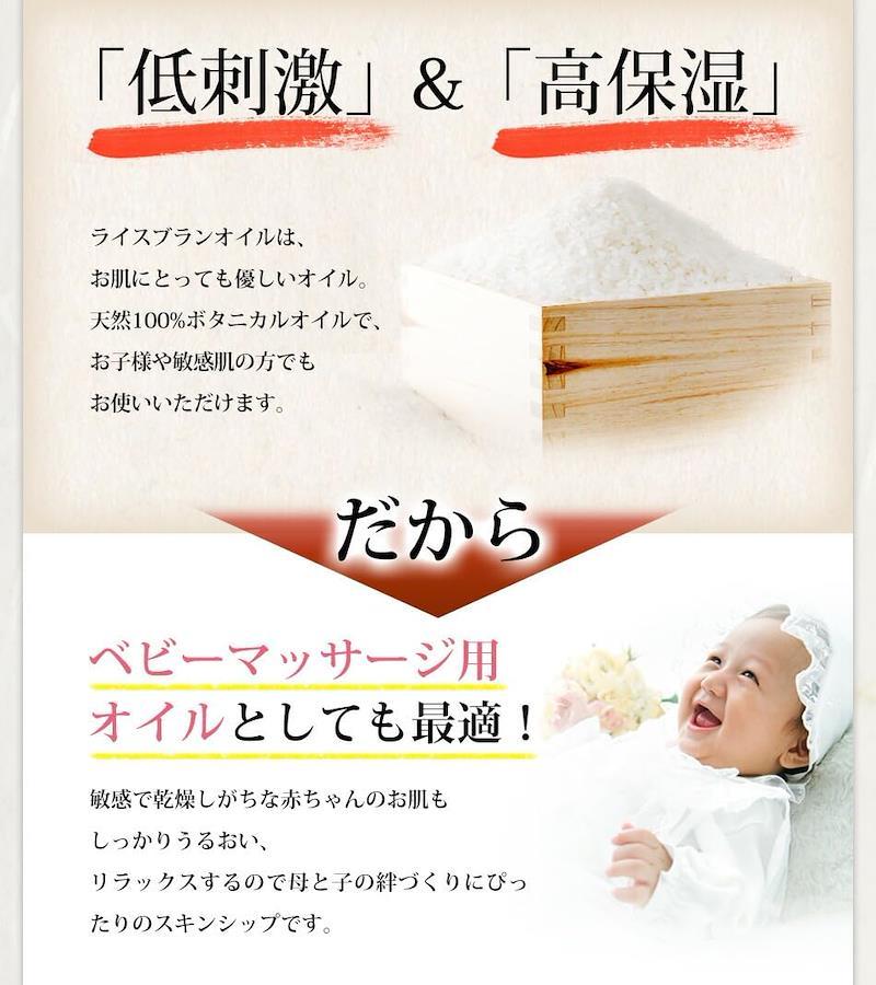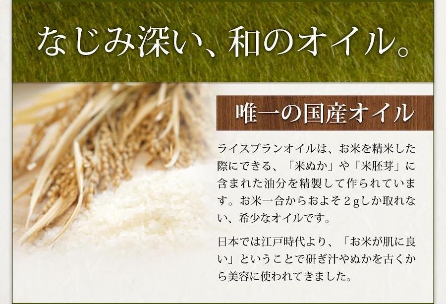 ■ライスブランオイル100% ■学名 : Oryza sativa ■英名 : Rice bran oil ■成分 : 米ぬか油 ■充填:日本(Made in Japan) ■原産国: 日本 ■製造方法 : 抽出法 ■性質 : 透き通った黄金色 天然由来100%植物性 合成香料、合成着色料無添加 ■開封後は冷暗所に保管の元、半年~1年を目安にご使用ください。■香り自体はほとんど無いオイルですが、ほのかにオイルの自然由来の香りがする場合がございます。■放射能検査を行っております。 ■低刺激で保湿力のあるマッサージ用のボディオイル、毎日のスキンケア、アロマのベースオイル等としてお使い下さい。お肌に潤いとハリを導く安心の国産オイル ■アロマオイル(エッセンシャルオイル・精油)などのブレンド用ベースオイルにも最適。他のキャリアオイルとブレンドすることで理想の使い心地のオリジナルブレンドオイルを作れます。※キャリアオイルに対して精油が1%以下になるようにブレンドするのが一般的。 ■5つの無添加 ~本当にお肌にとっていいものを使って頂きたい。そんな思いから、合成物質は使わず、自然由来の原料にこだわっています。~【防腐剤不使用 石油系界面活性剤不使用鉱物油不使用 合成香料不使用 合成色素不使用 】 ■米油はお米を精米したときにできる米ぬかを栄養分を残したまま、油分のみを抽出して作られたオイル。そんな栄養成分の多い胚芽や糠からできるライスブランオイルは食物繊維、ビタミンやミネラル等多くの栄養素含まれており、テレビや雑誌などでもしばしば紹介されるようになりました。スキンケア・マッサージオイル・湯船のお湯にたらせば保湿・髪のケアにも使用ができる万能美容オイルです。 【毎日のケアで潤う素肌へ】毎日のスキンケア・ボディケアにライスブランオイルを取り入れて、潤いのあるお肌作り。●美容オイルとして…化粧水後に1~2滴手のひらで伸ばし、顔に薄く塗って肌にヴェールを作りしっかり保湿!●トリートメントオイルとして…乾燥が気になる時に。てのひらに適量取り、体に延ばします。お風呂上りがなじみやすくおすすめ。●ベビーマッサージオイルとして…低刺激なオイルだから、ベビーマッサージにもお使い頂けます。肌の触れ合いを通して、親子の絆を深めましょう。 ■ポンプの開け方は、画像よりご参照ください。