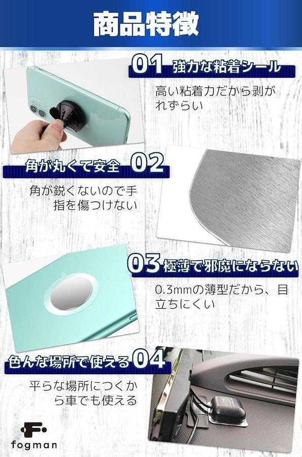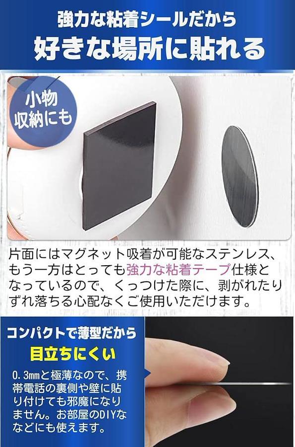 「商品特徴」 強力な粘着シール:高い粘着力だから剥がれずらい 角が丸くて安全:角が鋭くないので手指を傷つけない 極薄で邪魔にならない:0.3mmの薄型だから、目立ちにくい 色んな場所で使える:平らな場所につくから車でも使える