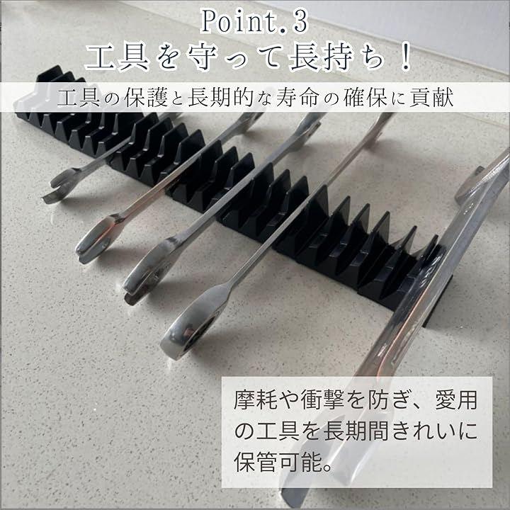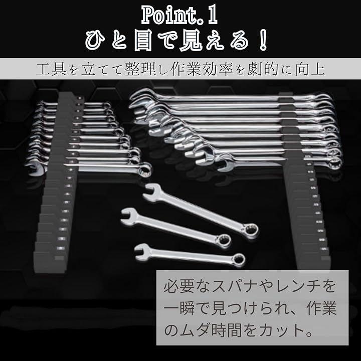 「工具を立てて整理し作業効率を劇的に向上」従来の工具箱のように工具を平置きせず、ホルダーに立てて整理することで、使いたいレンチやドライバーのサイズや種類が一目でわかります。