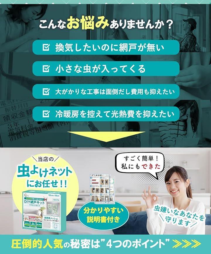 「細かい網目で虫ゼロに」本商品は一般的な網目よりもさらに細かい網目(20メッシュ)です。