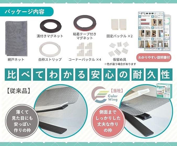 「どんな窓枠でも使える」粘着付きマグネットテープを窓枠に貼って使うため、木製の窓枠やアルミの窓枠などでも使用できます。