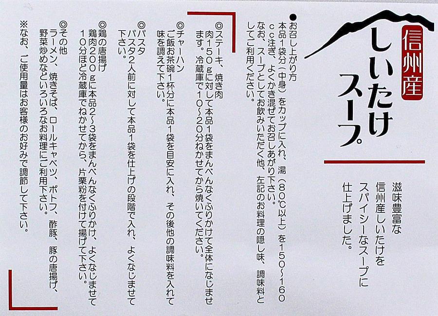 ・滋味豊富な信州産しいたけを、スパイシーなスープに仕上げました。・携帯しやすい個包装タイプなので、いつでもどこでもお湯を注ぐだけで簡単にお召し上がり頂けます。