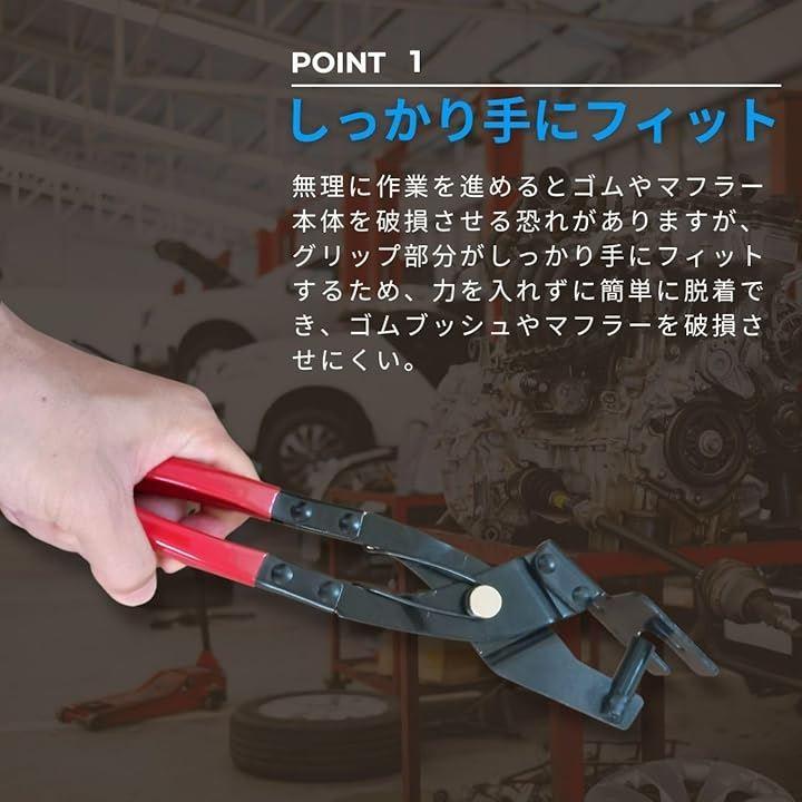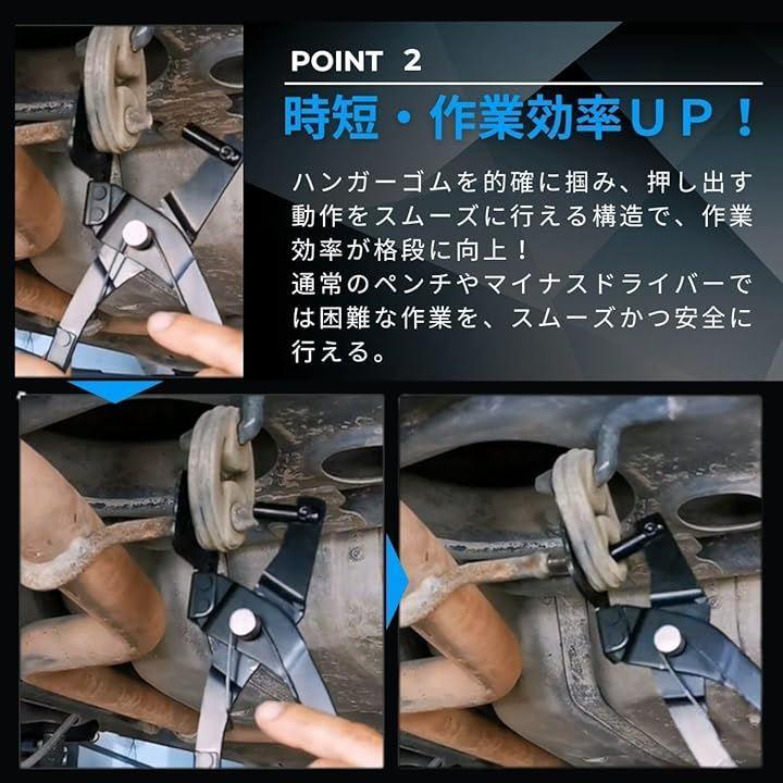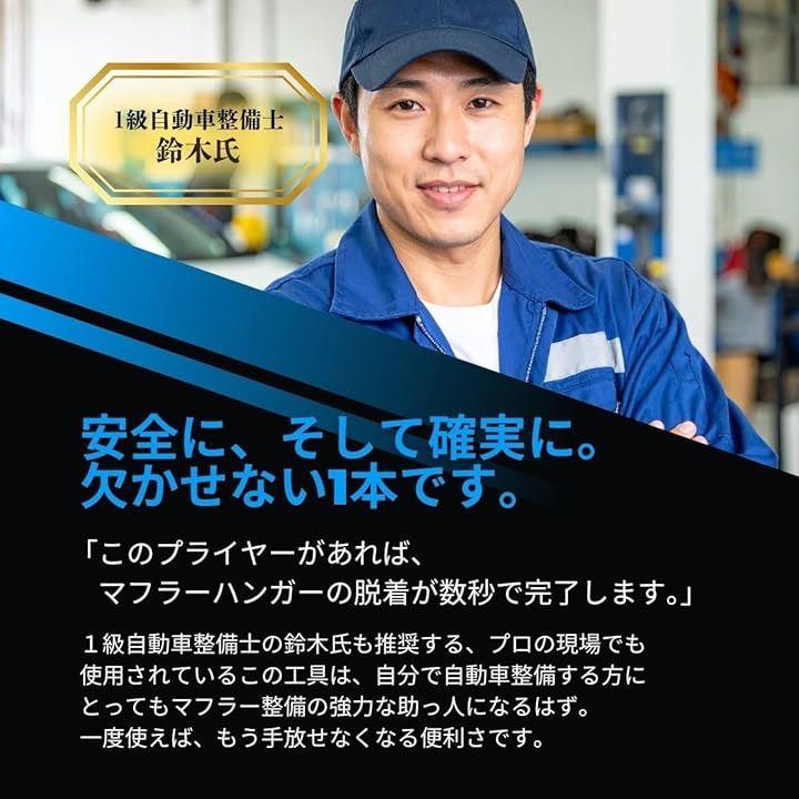 「マフラーハンガーの着脱専用工具」 ゴム製ハンガーを簡単脱着可能。