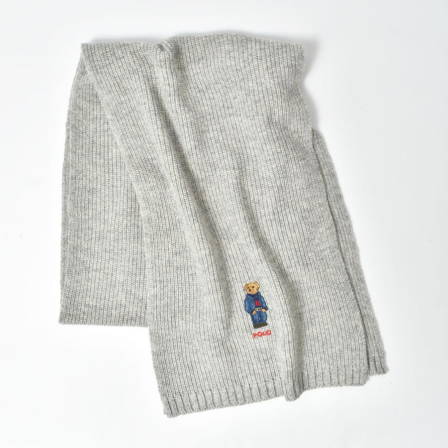 【SOLID DENIM BEAR SCARF】デニムルックの愛らしいマスコットキャラクター「POLO BEAR(ポロベア)」を刺繍したマフラー。リブ編みのミニマルなデザインが特徴です。優れた保温性とソフトな肌触りで、優しく首元を包みこみます。お好みのスタイルにアレンジがしやすい長さもポイント。ユニセックスデザインなのでお揃いや誕生日やクリスマスのプレゼントにもおすすめです◎