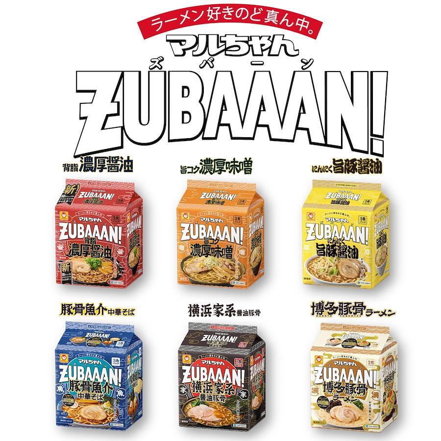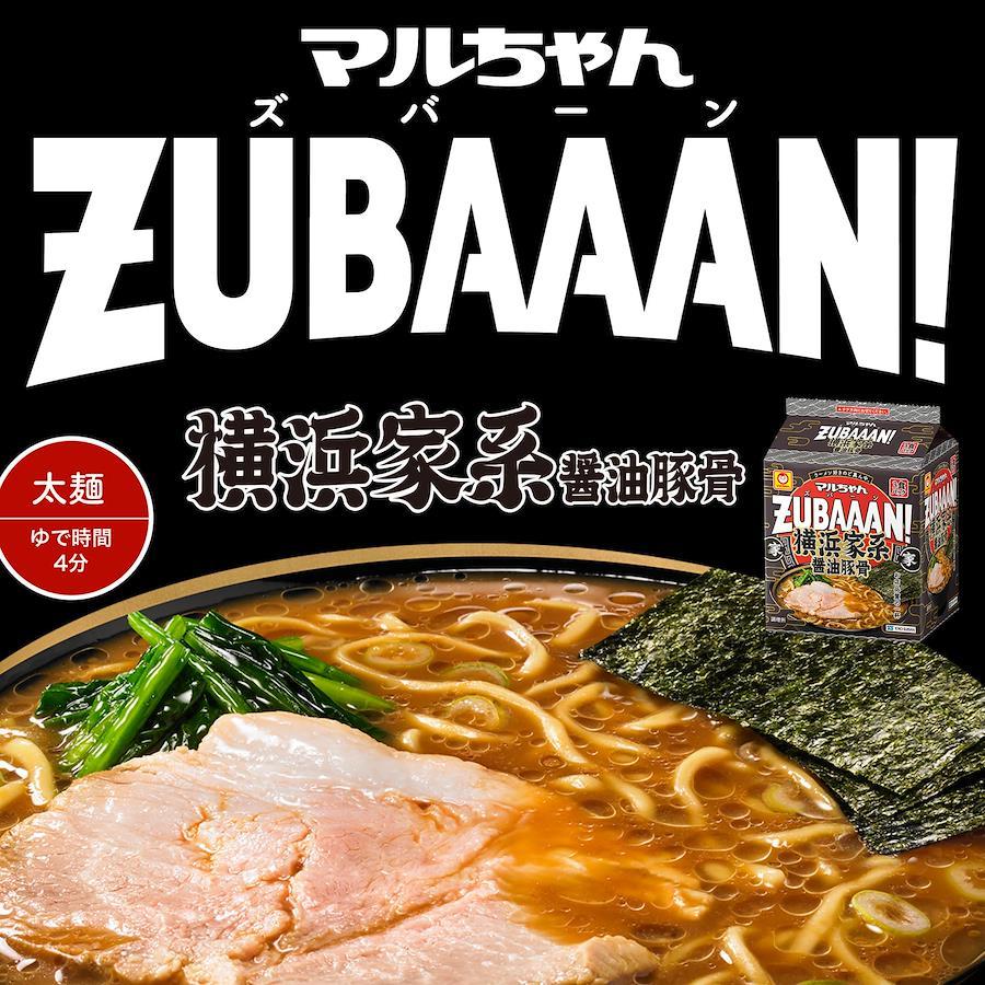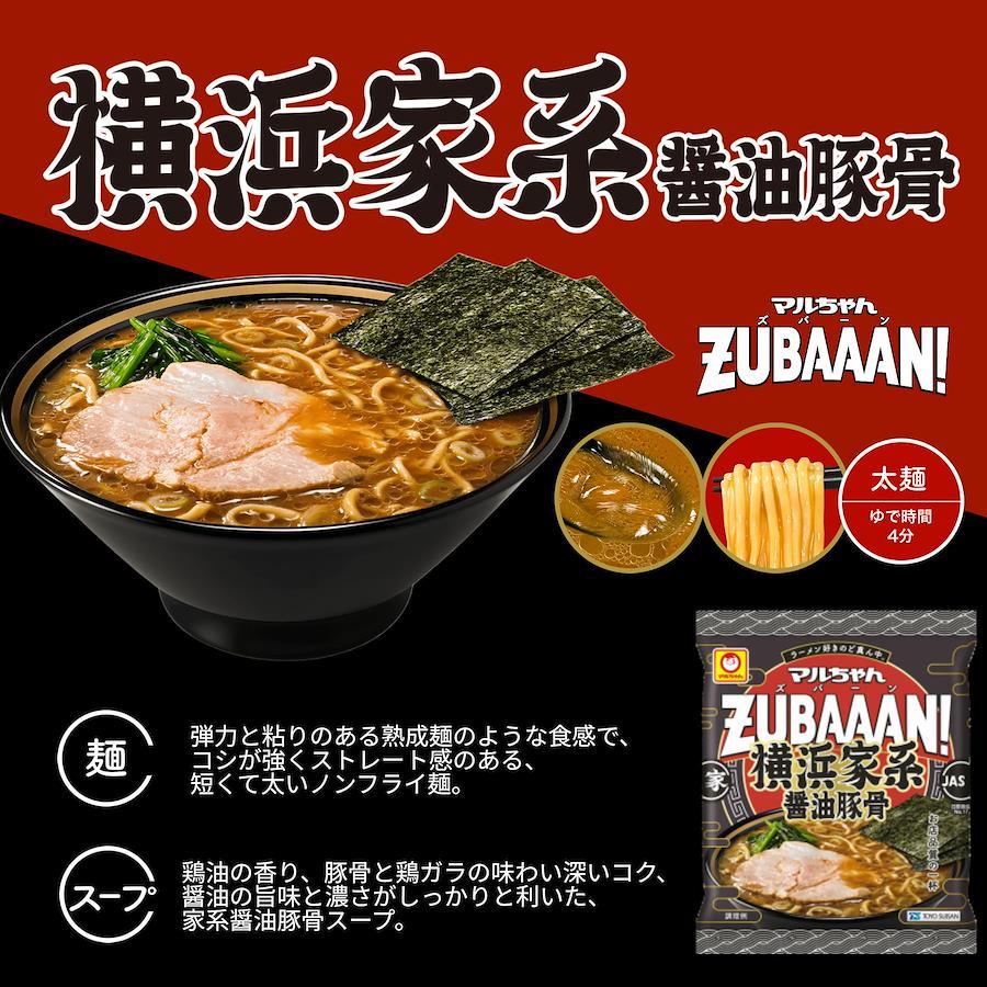 マルちゃんZUBAAAN!シリーズに横浜家系が登場!お家で食べられるラーメンの歴史が変わる!?これでいいや、ではなくこれがいい!と思える、袋麺の簡便性を兼ね備えた、誰もがお家にいながらにして、手軽に“お店品質のあの味”を楽しめるラーメン。熟成麺のような弾力や粘りとコシの強い麺に、鶏油の香り、コク、醤油の旨味が利いた家系醤油豚骨スープ。弾力と粘りのある熟成麺のような食感で、コシが強くストレート感のある、短くて太いノンフライ麺。鶏油の香り、豚骨と鶏ガラの味わい深いコク、醤油の旨味と濃さがしっかりと利いた、家系醤油豚骨スープ。