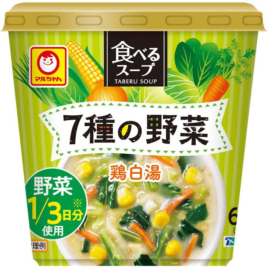 野菜でお腹を満たす食べるスープ一杯に厚生労働省が推奨する一日に必要な野菜摂取量350gの3分の1の野菜が入ったカップスープ。【具材】キャベツ・たまねぎ・ねぎ・にんじん・小松菜・チンゲン菜・コーンチキンエキスをベースに、魚介エキスの旨みを加えたまろやかな鶏白湯スープにすりごまを加え、風味豊かに仕上げました。