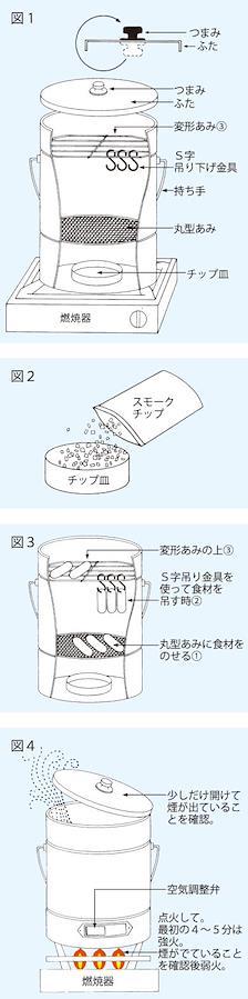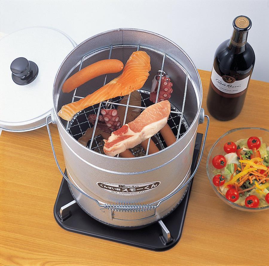 燻製料理が簡単にできる。網は便利な2枚付き(丸型と変形型)、空気調整弁付き。ちっぷの継ぎ足しも楽々。熱源はガスコンロやカセットコンロ、練炭火鉢や炭火コンロなどで気軽に出来る。