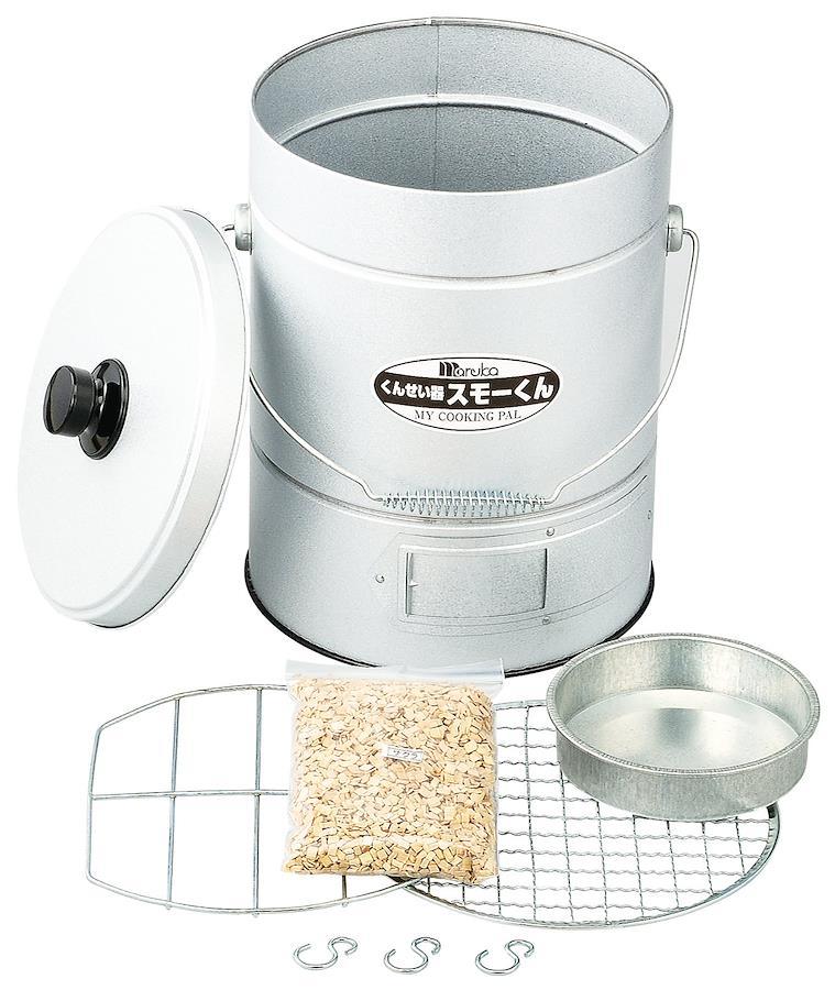 原産国:日本サイズ:直径24.5×高さ34.5cm重量:約1.3kg材質:本体・フタ/ガルバリウム鋼板、持ち手/亜鉛鉄線、つまみ/ベークライト、チップ皿/亜鉛鉄板、丸型網/亜鉛鉄線、変形網/鉄線付属品:チップ/サクラ100g、S字釣り金具×3個、チップ皿、丸型網、変形網