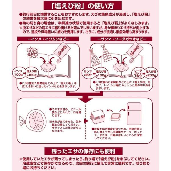 エサ持ちを高め、エビ効果をプラス 魚の切り身、イカタン、虫エサにまぶすと、身が締まってエサ持ちと手返しがアップ。同時に、配合したエビの成分が集魚・摂餌力も高めます。● 投げ釣りエサ用まぶし粉● 注意:虫エサなどの活きエサに振りかけると死んでしまいますが、身が締まりエサ持ちが向上するので、遠投や深場狙いに威力を発揮します。さらに成分が浸透し集魚効果も高まります。内容量:750g主原材料 エビ粉、食塩、着色料 栄養成分 粗タンパク4.3%以上、粗脂肪1.8%以下、粗灰分95.7%以下、炭水化物1.3%以下保存方法 直射日光・高温多湿を避けて保存してください。