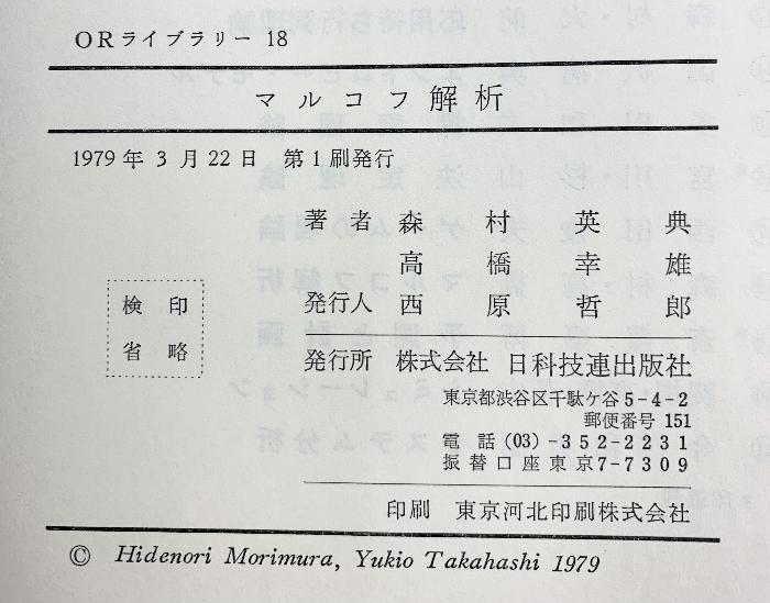 マルコフ解析 (ORライブラリー 18) 日科技連出版社 森村 英典