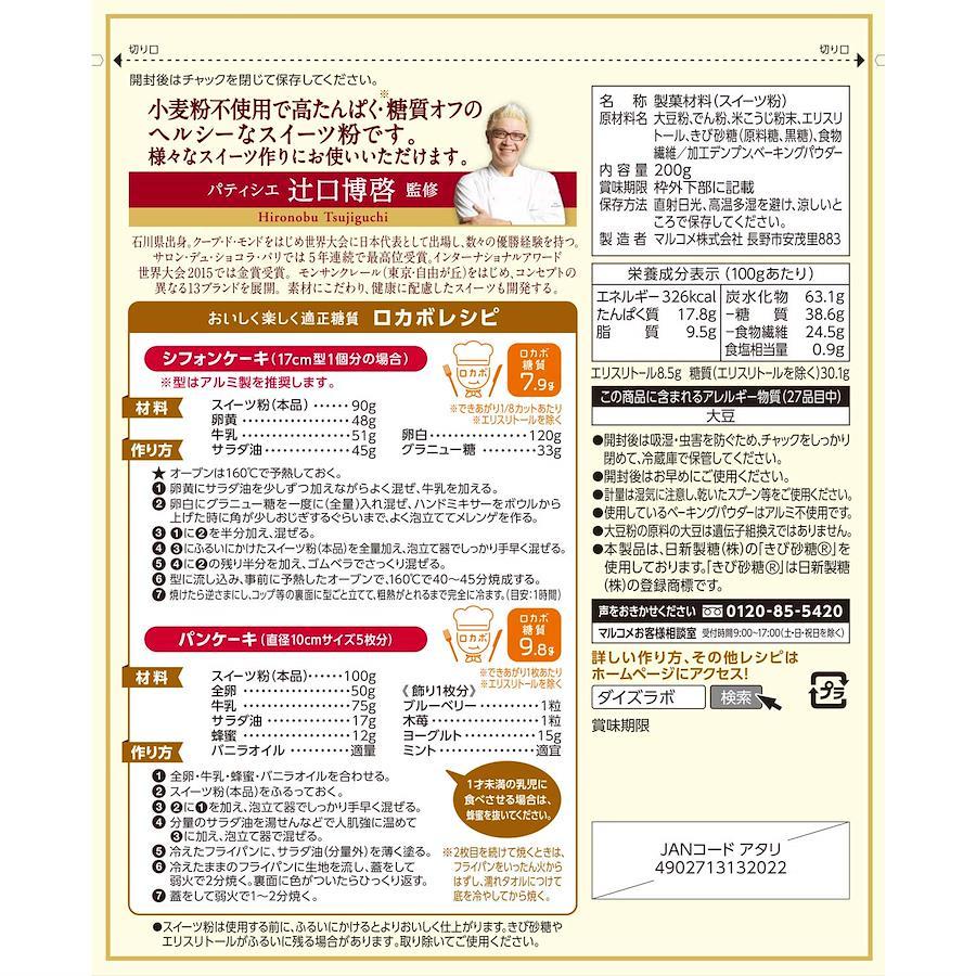 【内容量】200g×12個【原材料】大豆粉、でん粉、米こうじ粉末、エリスリトール、きび砂糖(原料糖、黒糖)、食物繊維/加工デンプン、ベーキングパウダー【商品特徴】人気パティシエ辻口博啓氏監修のスイーツ粉を既存品より糖質を約50%カット(※)してリニューアル。【糖質カット】大豆粉を主原料とし、食物繊維や加工デンプンなどを使用して糖質をおさえつつ、カロリーゼロの糖アルコールであるエリスリトールを使用することで、甘味もあっておいしいスイーツができる配合に仕上げました。【上品な甘み】米糀粉末ときび砂糖Rによりしっとりとまろやかで上品な甘みを楽しめます。さまざまなスイーツに幅広く使え、間食のロカボ基準を満たす低糖質スイーツをつくることができます。【重要】メーカーによる商品リニューアルに伴いパッケージ(内容量も含む)変更が行われた場合、新パッケージでお届け致します事ご了承願います。