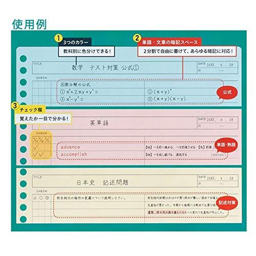 ■商品情報 ●「必要なページだけ持ち出せる」「大切なページを集めて編集ができる」というのはルーズリーフだからこそ出来ること。 ●半分に折って使う、赤シートを使うなど、移動中やスキマ時間を勉強に活用しやすくなります。 ●単語帳や単語カードよりも、たくさん書けるルーズリーフです。 ●普段ノートを使ってる人も暗記ルーズリーフをプラスすることで効率アップ! ●社会人の資格勉強にも最適です。 ■特長 ●ポイント1 ◆教科分けできる3つのカラー「色で教科を識別」 ◆国語系は赤色、数学系は青色など教科で色分けができるので一目で管理がしやすいです。 ●ポイント2 ◆単語も文章も暗記できる「単語よりもたくさん書ける」 ◆行数によってアレンジできるから単語だけじゃなく、文章例や数式なども暗記できる。 ●ポイント3 ◆覚えたか分かるチェック欄「チェック欄が自信になる」 ◆どこまで暗記出来たか、チェックをつけることで勉強の効率アップ。テスト前は出来てないところを重点的に暗記ができる。