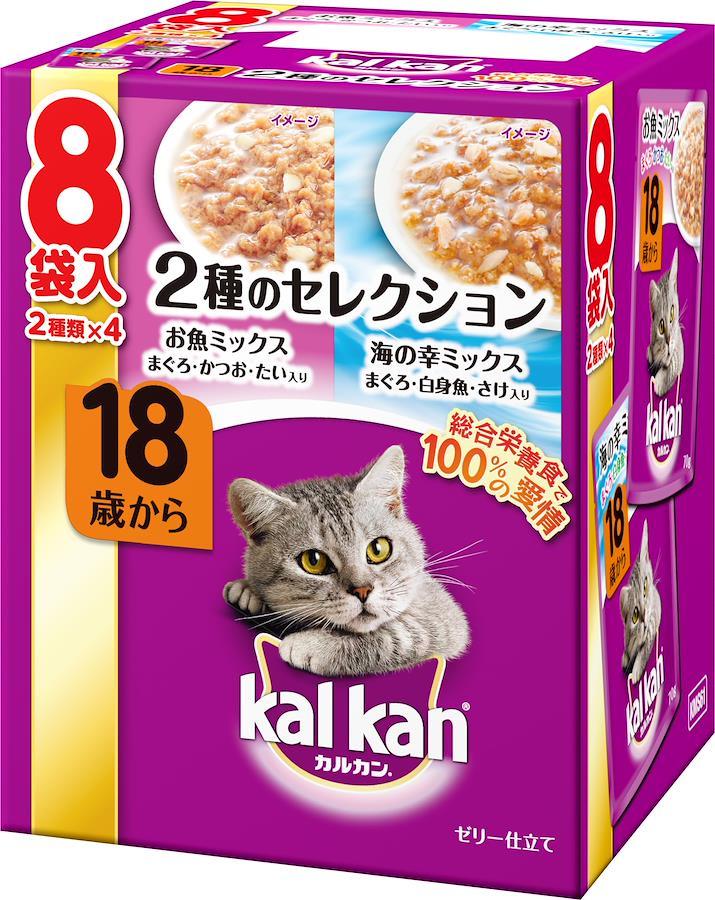 好評な2種類の味のセレクション。まぐろ・かつお・たい入り、まぐろ・白身魚・さけ入りは、厳選された素材をカルカン特製だしで煮込み、ジューシーなゼリー仕立てにしました。18歳以上の猫に必要な栄養素がバランスよく含まれた総合栄養食です。