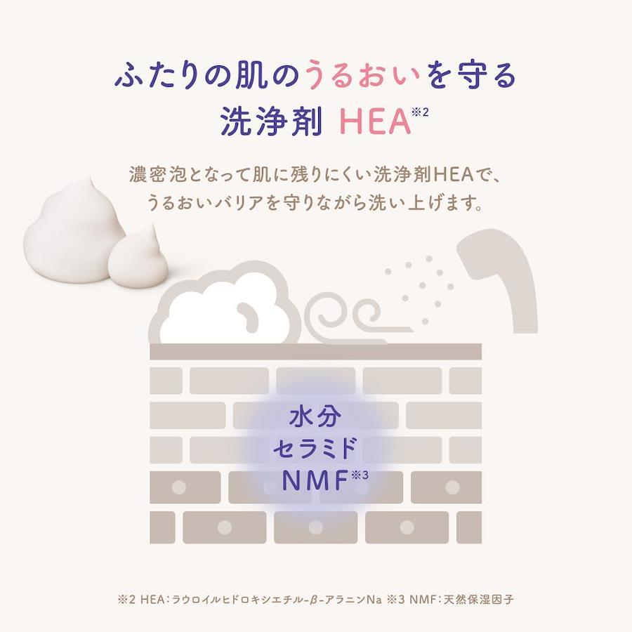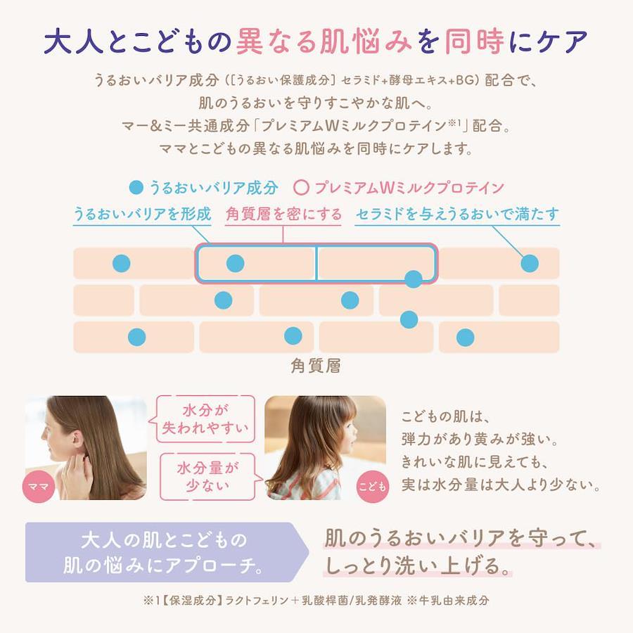 ●変化を感じるおとなの肌と成長過程のこどもの肌に●液体で出てくるボディソープ●少量でサッと泡立つクリーミーなふわ密泡でうるおいバリアを守って洗う●保湿成分プレミアムWミルクプロテイン配合●うるおいバリア成分:セラミド+酵母エキス+BG(うるおい保護)配合●植物由来アミノ酸系洗浄成分●サッと流せる●やさしく包みこむアップル&ピオニーの香り●サルフェートフリー・パッチテスト済●こどもと一緒に使える ??【大人とこどもの肌の うるおい をやさしく守る】 肌の水分量が少なくカサカサになりやすいこどもの肌 と 水分が失われやすく乾燥しがちなママの肌 を同時にケア。肌のうるおいバリアを守って、しっとり洗いあげます。 ??【 こども と一緒に使える 液体 タイプの ボディソープ 】 うるおい を残しながら全身をやさしく洗う ベビーソープ 。少量ですぐに泡立つ濃密泡で、洗いあがりしっとりなめらか。ふっくらうるおう肌へ。植物由来アミノ酸系洗浄成分配合。サルフェートフリー(硫酸系界面活性剤不使用)処方。 ??【片手でも簡単!親子で押しやすいポンプヘッド】ポンプヘッドが平たく大きいため、こどもの小さな手でも、こどもを抱えながらの片手(親指)でも押しやすい。 ??【香り】やさしく包み込むアップル&ピオニーの香り。 ??【開発の想い】おふろの時間は、おはなしの時間。いろんなことがあった一日のおわり。今日は何があったかな。明日もいいことあるかな。やさしく語り合うバスタイムは、ありのままの気持ちでゆっくり向き合えるかけがえのない親子の時間です。こどもと過ごすバスタイムが親子の笑顔がこぼれる大切な時間になりますように。