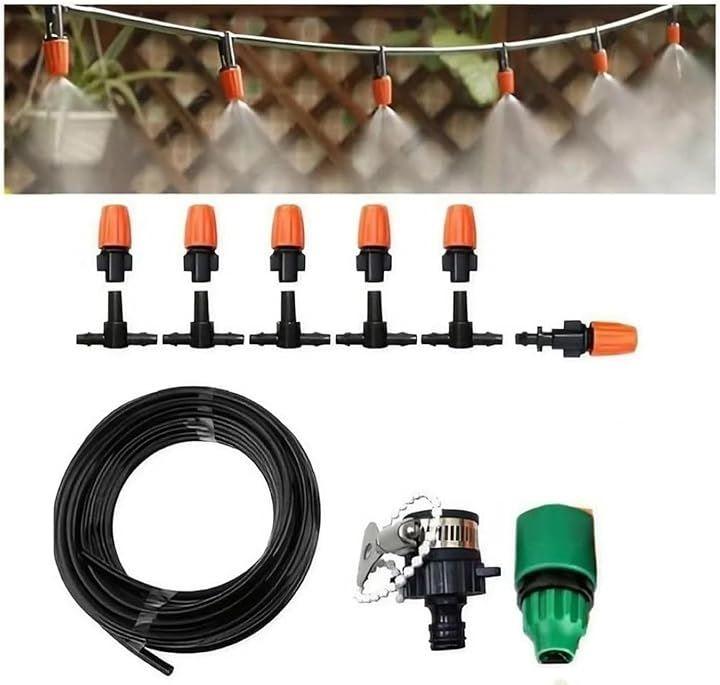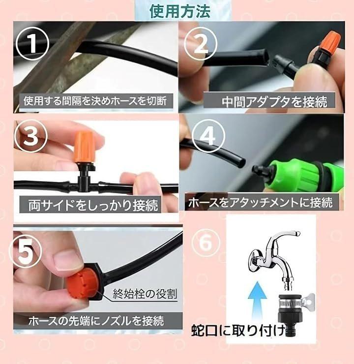 ❺セット内容: 専用チューブ(15m)x1、ミストノズルx15、末端用キャップx1、蛇口ニップルx1、蛇口用コネクターx1、チューブコネクターx1、