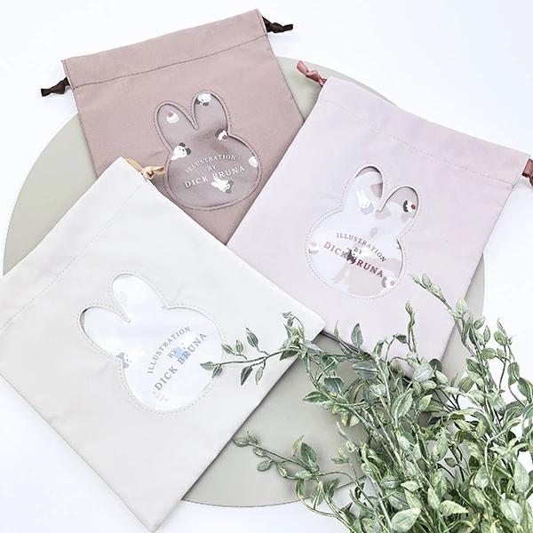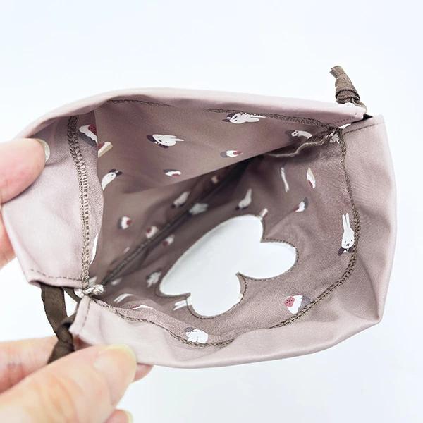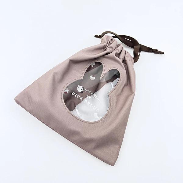 ミッフィーのフルーツ柄、巾着です♪大人女子のくすみカラー♪巾着の裏地もミッフィーのフルーツ柄で、とってもキュート♪外側にクリアのミッフィーの可愛い顔があるため、巾着の中身が見えて使いやすい☆彡