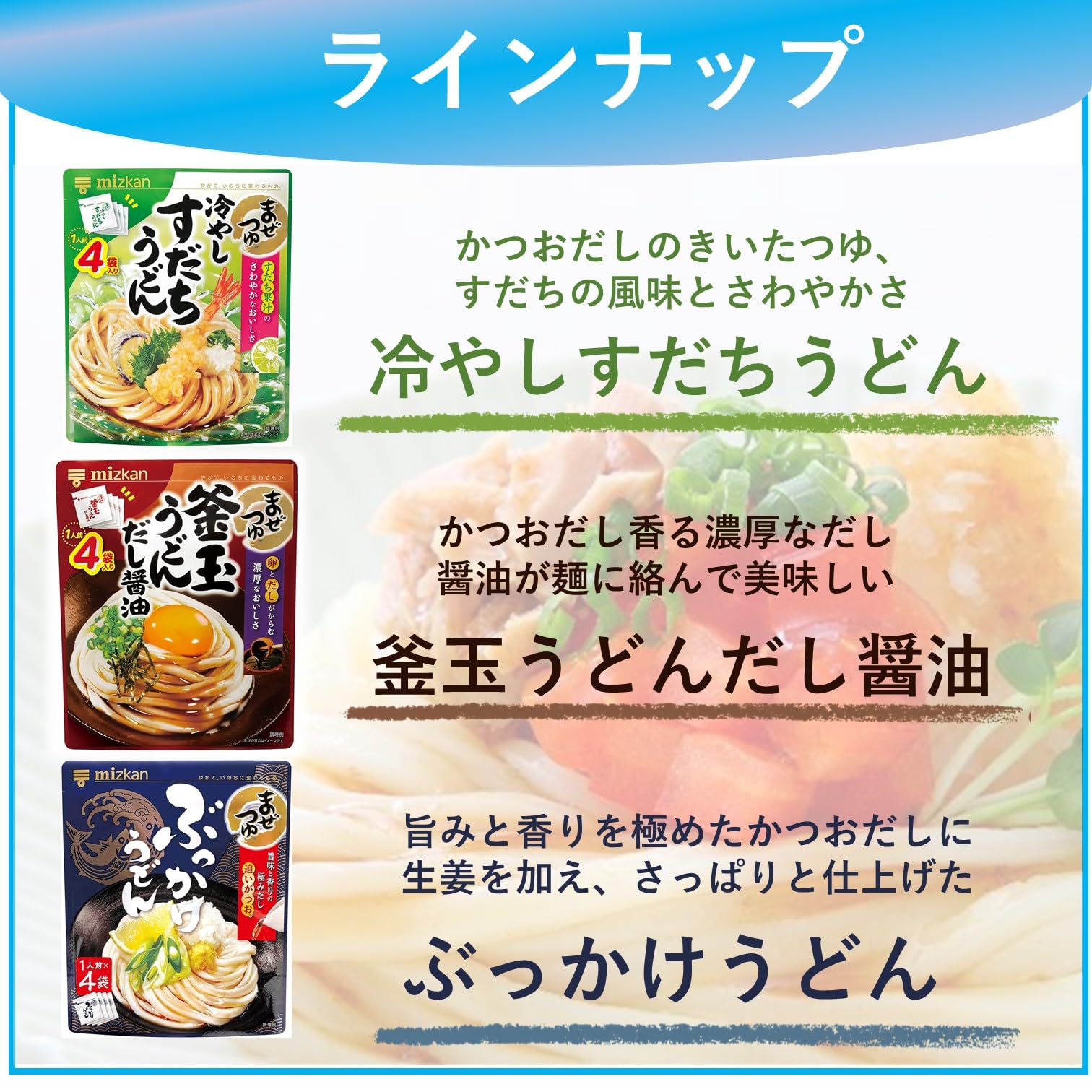 うどんなどの麺にかけるだけでいつもと違う美味しさが楽しめる、1人前使い切りの小袋が4袋入っている麺用調味料です。1人での食事から家族の食事まで幅広いシーンで広く手軽にお使いいただけます。味の種類は、旨味と香りを極めたかつおだしに、生姜を加えさっぱりと仕上げたぶっかけうどんのつゆです。ストレートタイプなので、麺にかけるだけで手軽にお召し上がりいただけます。お好みでねぎ、生姜、大根おろし、レモン等をのせると美味しくお召し上がりいただけます。