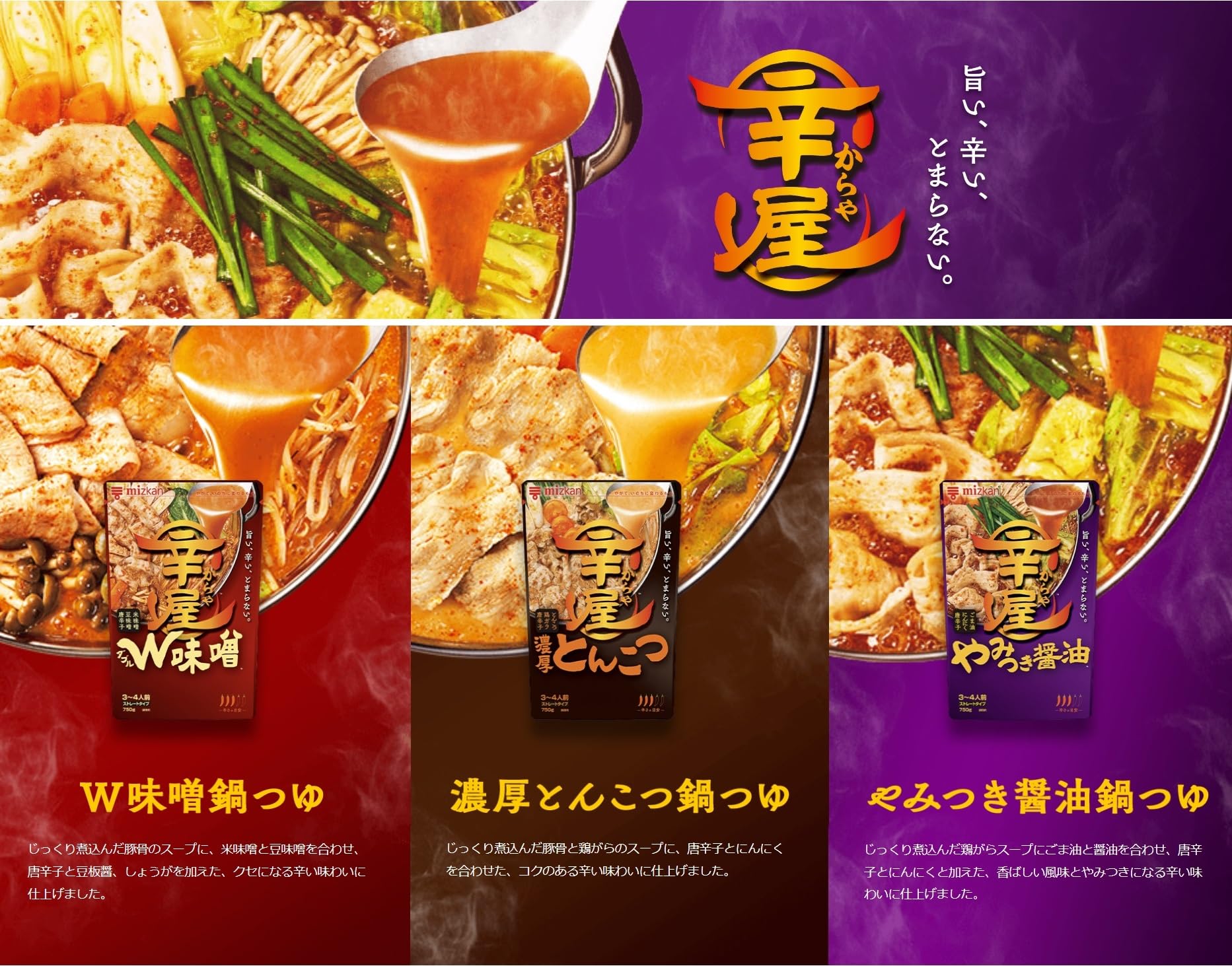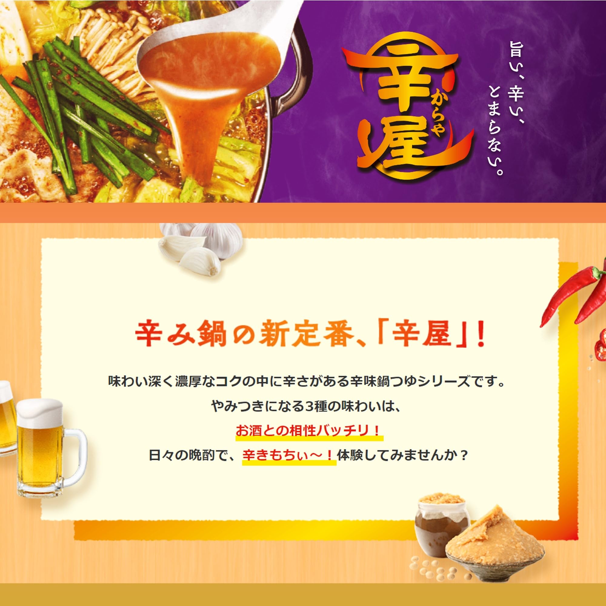 味わい深く濃厚なコクの中に辛さがある、辛み鍋つゆ(辛鍋・鍋の素・鍋スープ・なべつゆ)シリーズです。じっくり煮込んだ鶏がらスープにごま油と醤油を合わせ、唐辛子とにんにくと加えた、香ばしい風味とやみつきになる辛い味わいが特徴です。使い切りパウチ容器使用の3~4人前750g入り、ストレートタイプです。