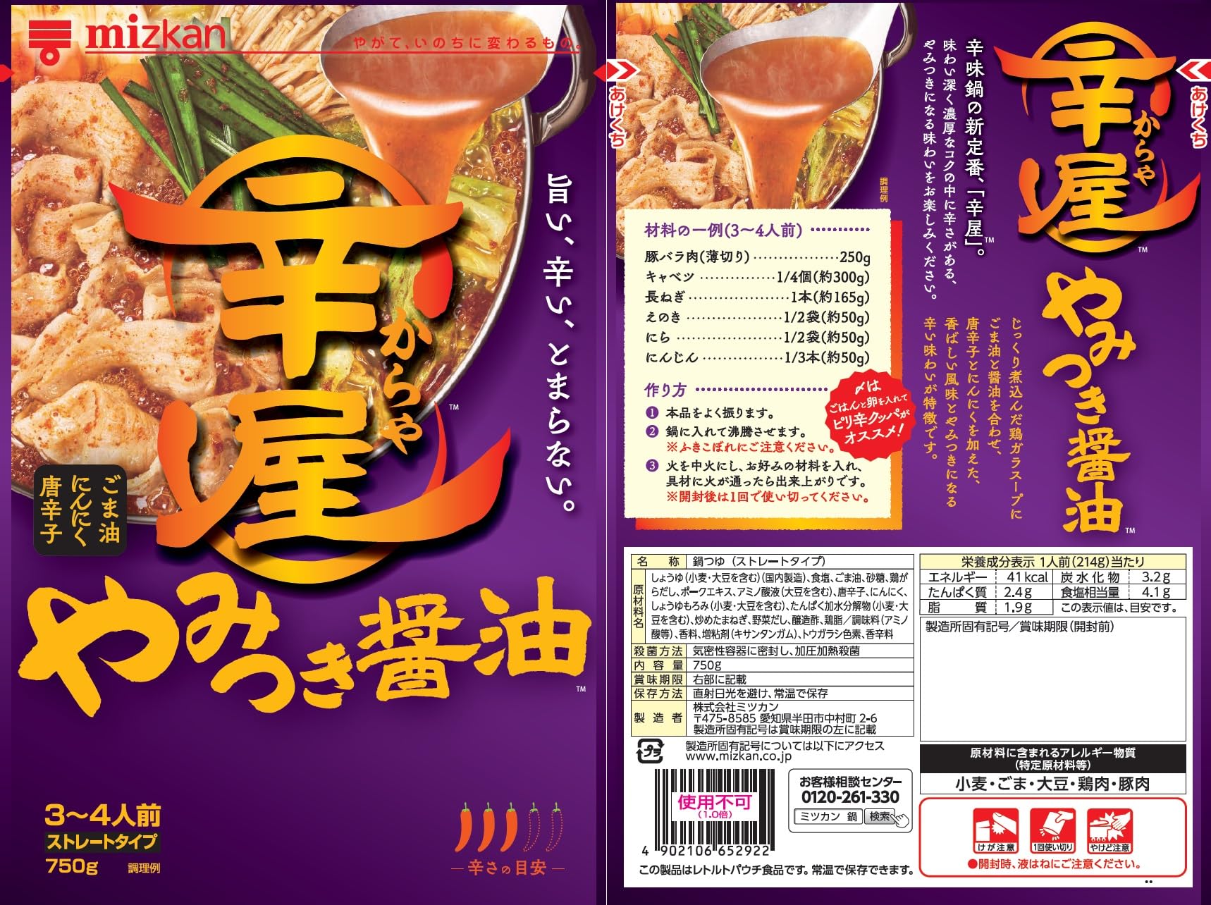原材料:しょうゆ(小麦・大豆を含む)(国内製造)、食塩、ごま油、砂糖、鶏がらだし、ポークエキス、アミノ酸液(大豆を含む)、唐辛子、にんにく、しょうゆもろみ(小麦・大豆を含む)、たんぱく加水分解物(小麦・大豆を含む)、炒めたまねぎ、野菜だし、醸造酢、鶏脂/調味料(アミノ酸等)、香料、増粘剤(キサンタンガム)、トウガラシ色素、香辛料1人前(214g)当たり エネルギー:41kcal、たんぱく質:2.4g、脂質:1.9g、炭水化物:3.2g、食塩相当量:4.1gミツカンの 辛み鍋つゆ ( 辛鍋 )シリーズストレートタイプ の 鍋の素 ( 鍋つゆ ・ なべつゆ ・ 鍋スープ )です。ブラント名: ミツカン【重要】メーカーによる商品リニューアルに伴いパッケージ(内容量も含む)変更が行われた場合、新パッケージでお届け致します事ご了承願います。