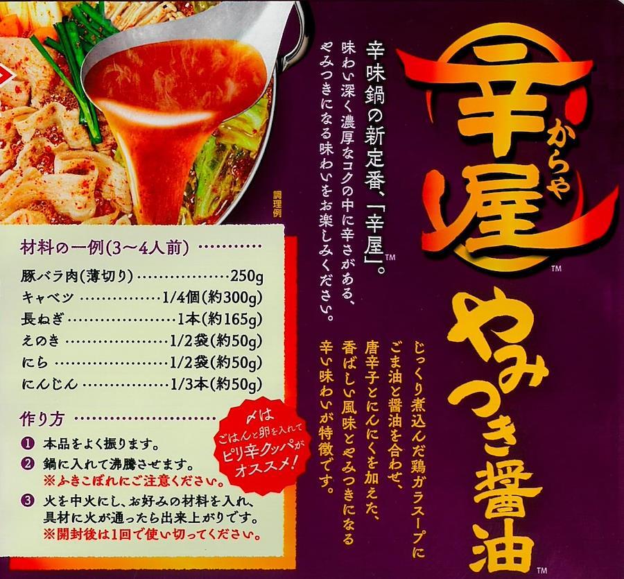 しょうゆ(小麦・大豆を含む)(国内製造)、食塩、ごま油、砂糖、鶏がらだし、ポークエキス、アミノ酸液(大豆を含む)、唐辛子、にんにく、しょうゆもろみ(小麦・大豆を含む)、たんぱく加水分解物(小麦・大豆を含む)、炒めたまねぎ、野菜だし、醸造酢、鶏脂/調味料(アミノ酸等)、香料、増粘剤(キサンタンガム)、トウガラシ色素、香辛料