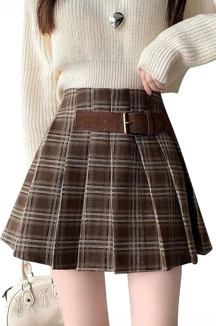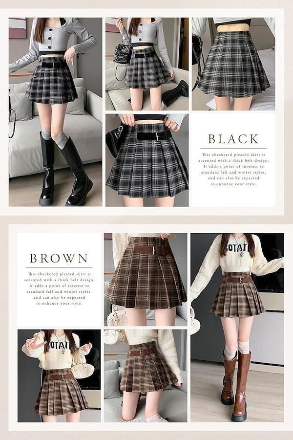 ポイント(1):太めのベルトデザインがアクセントになったチェック柄ミニプリーツスカート。韓国風スタイルやスクールガール風、ガーリーコーデやカジュアルコーデ等、幅広いスタイルで大活躍。