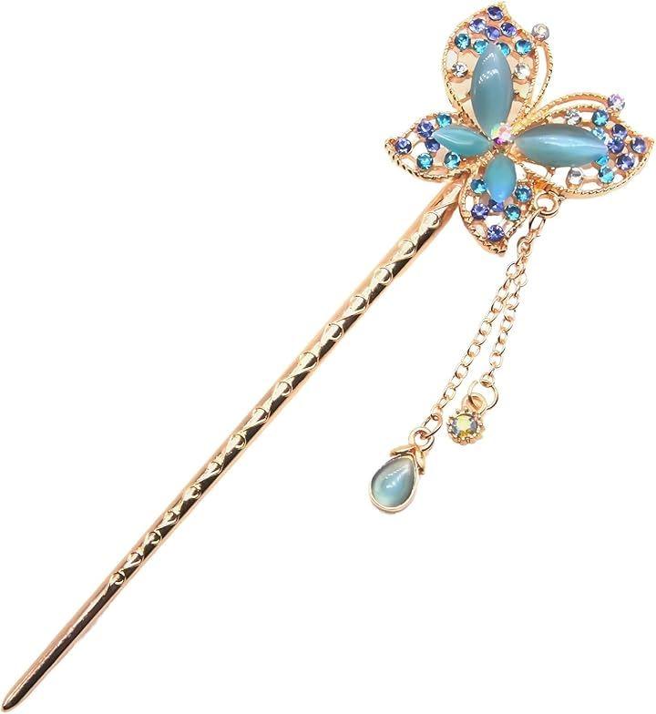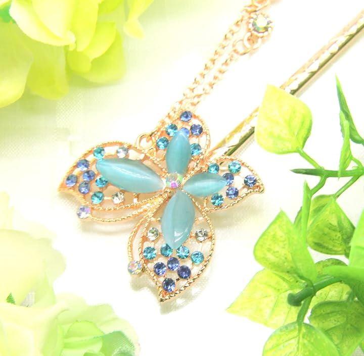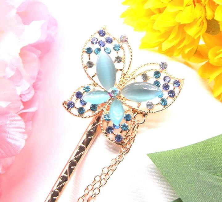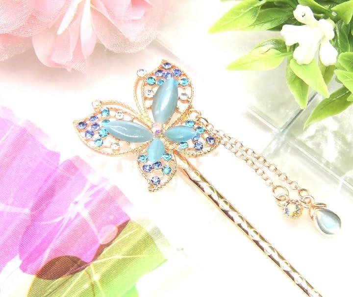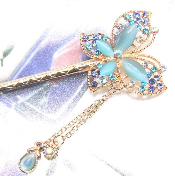 「蝶々モチーフかんざし」ピンクゴールドのヘアスティックに人気モチーフの蝶々が上空を悠々と羽根を広げて飛んでいるデザインで、美しさと優雅さを象徴するアイテムです。