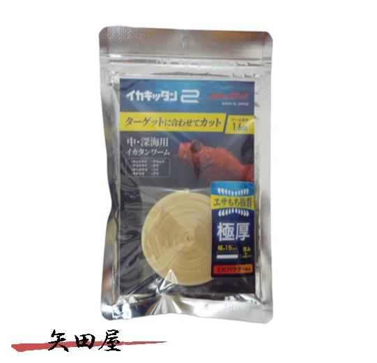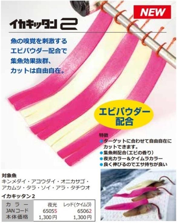 全長16cmの【イカキッタン2】を深海のターゲットに応じてカットして使えます。エビパウダー配合と夜光・ケイムラカラーで集魚効果抜群!良く伸びるのでエサ持ちもいい。深海のベニアコウ・アコウダイに威力を発揮します。ターゲットに合わせて自由自在にカット出来ます集魚剤配合(エビの香り)良く伸びるのでエサ持ちが良い