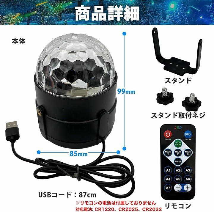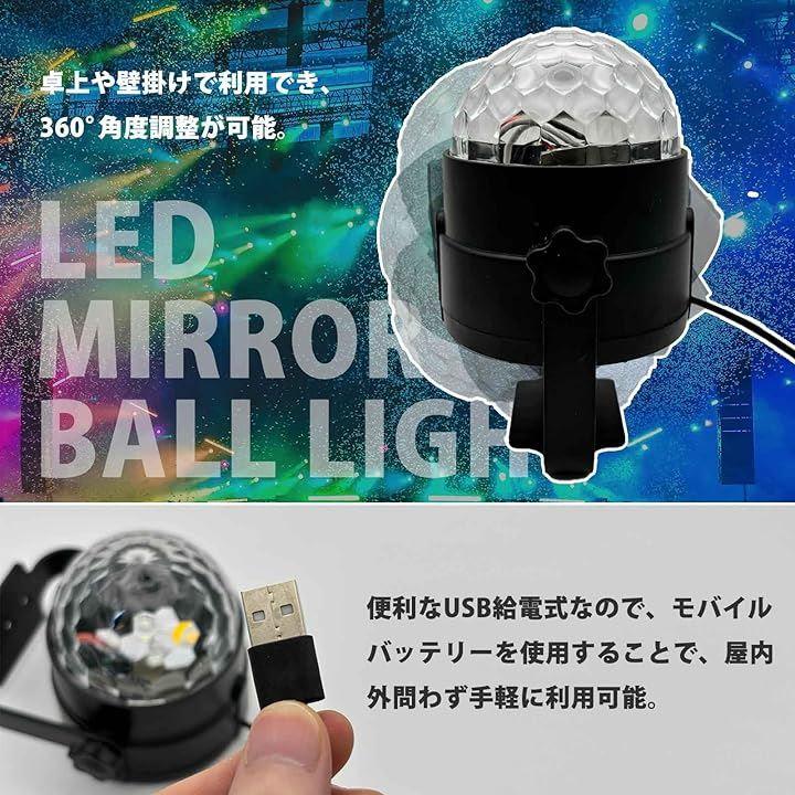 「商品概要」このUSB給電式 LEDミラーボールライトは、リモコンが付属しており、遠隔操作で多種多様な色パターンや内蔵モーターによる回転制御ができます。