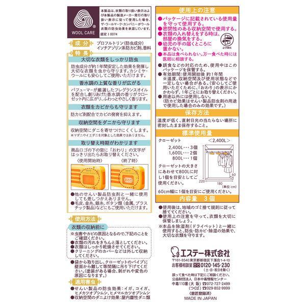 【使用上の注意】・パッケージに記載されている使用量を守って使用する。・密閉性のある収納空間で使用する。・衣類の入れ替えをする時は、部屋の換気をする。・幼児の手の届くところに置かない。・本品は食べられない。万一食べた時には医師に相談する。・誤食などの対応のため、使用中はこのパッケージを保管する。・用途以外には使用しない。(防カビ効果はせんい製品防虫剤の用途で使用した場合のみの効果です。)・使用後は、地域のゴミ捨て規則にしたがって捨ててください。