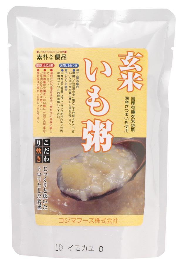 国内産水稲うるち玄米とさつまいもを鉄釜で調理した、こだわりの玄米いも粥です。米は山形産ひとめぼれ、食塩は海の精を使用。 国内産有機うるち玄米と国内産さつまいもを鉄釜でじっくりと炊き上げました。玄米が初めての方でも おいしくいただけるお粥です。 食塩は海の精を使用しています。 玄米のフィチン酸が新陳代謝を高め、繊維質は整腸作用を活発にします。