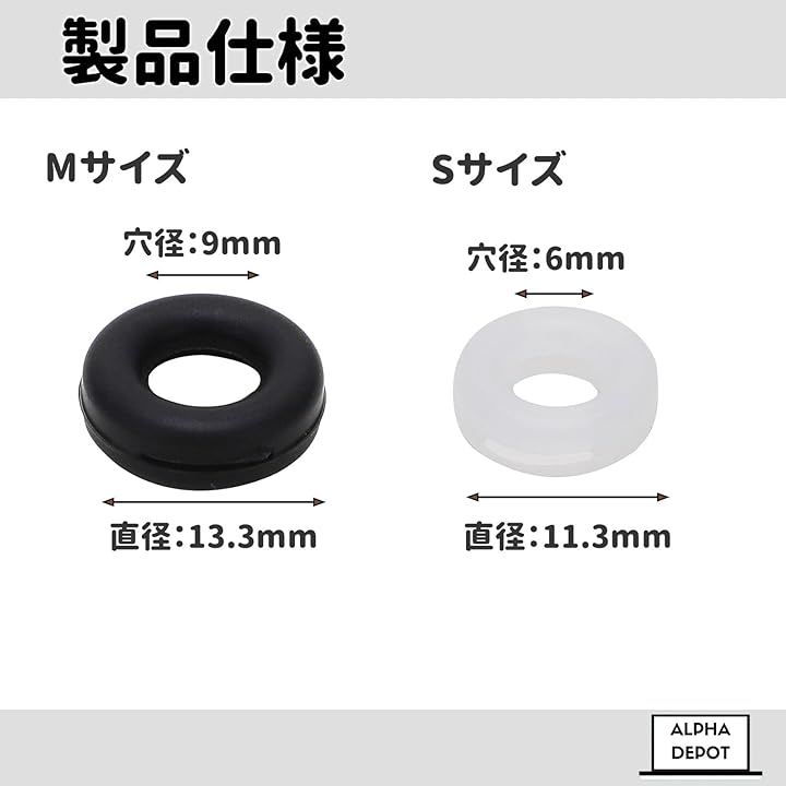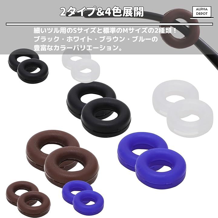 「商品詳細」サイズ2種 Sサイズ:直径約11.3mm / Mサイズ:直径約13.3mm / 素材:シリコン / カラー:ブラック・ホワイト・ブラウン・ブルー 各種4個ずつセット / 収納ケース付き