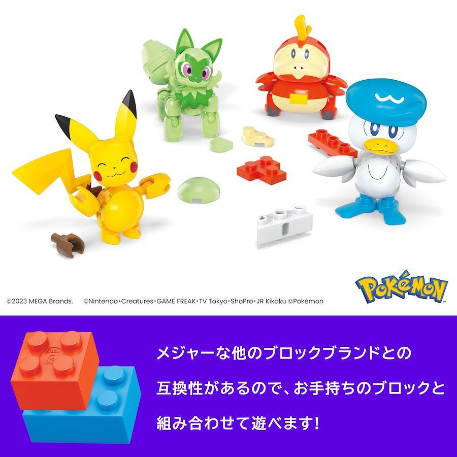 【内容】パルデア地方にいるポケモンが組み立てられるブロックセット。ピカチュウ・ニャオハ・ホゲータ・クワッスのポケモン4種がセットになっています。合計79ピース。ポケモンを組み立てたらお気に入りを決めて、ポケモンバトル!はじめてのごっこ遊びにぴったりのプレイセットです。2023 MEGA Brands. Nintendo・Creatures・GAME FREAK・TV Tokyo・ShoPro・JR Kikaku Pokemon