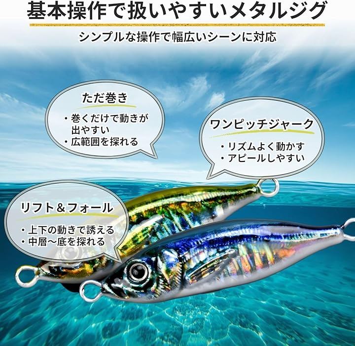 「リアル魚型デザイン&4色展開で状況に応じたカラー選択が可能」アジ、イワシなどのベイトフィッシュをイメージした細身シルエットとリアル調カラーを採用したメタルジグです。
