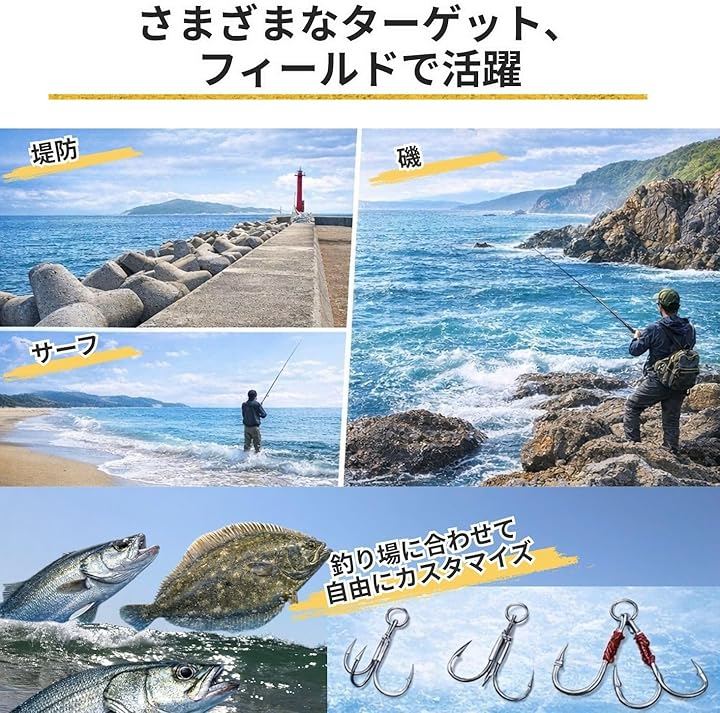 フロントフックやリアフックの組み合わせ、シングルフック、トレブルフックなど、釣り方や狙う魚種に応じたセッティングに対応できます。