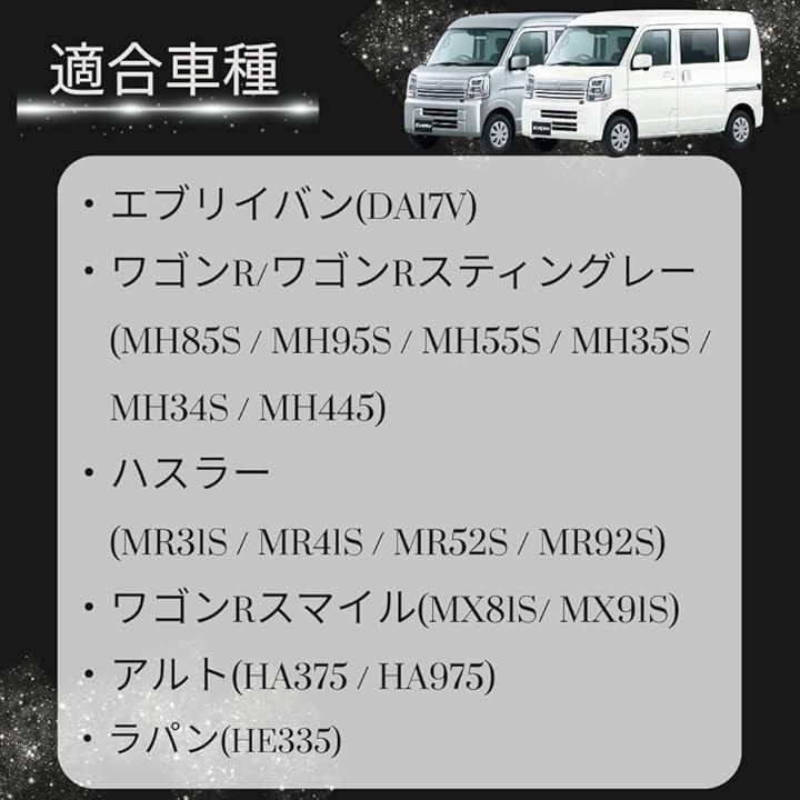 *「幅広い対応車種|スタイリッシュな純正風ルックに」 ・エブリイバン(DA17V) ・ワゴンR/ワゴンRスティングレー (MH85S / MH95S / MH55S / MH35S / MH34S / MH445) ・ハスラー(MR31S / MR41S / MR52S / MR92S) ・ワゴンRスマイル(MX81S/ MX91S) ・アルト(HA375 / HA975) ・ラパン(HE335)