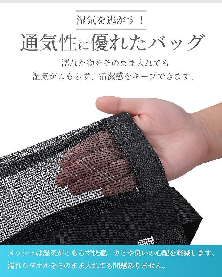 通気性に優れたメッシュ素材を使用し、濡れたものも気兼ねなく収納でき、乾きやすい設計で清潔さを保ちます。