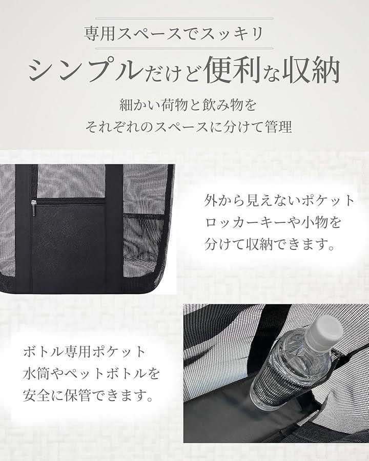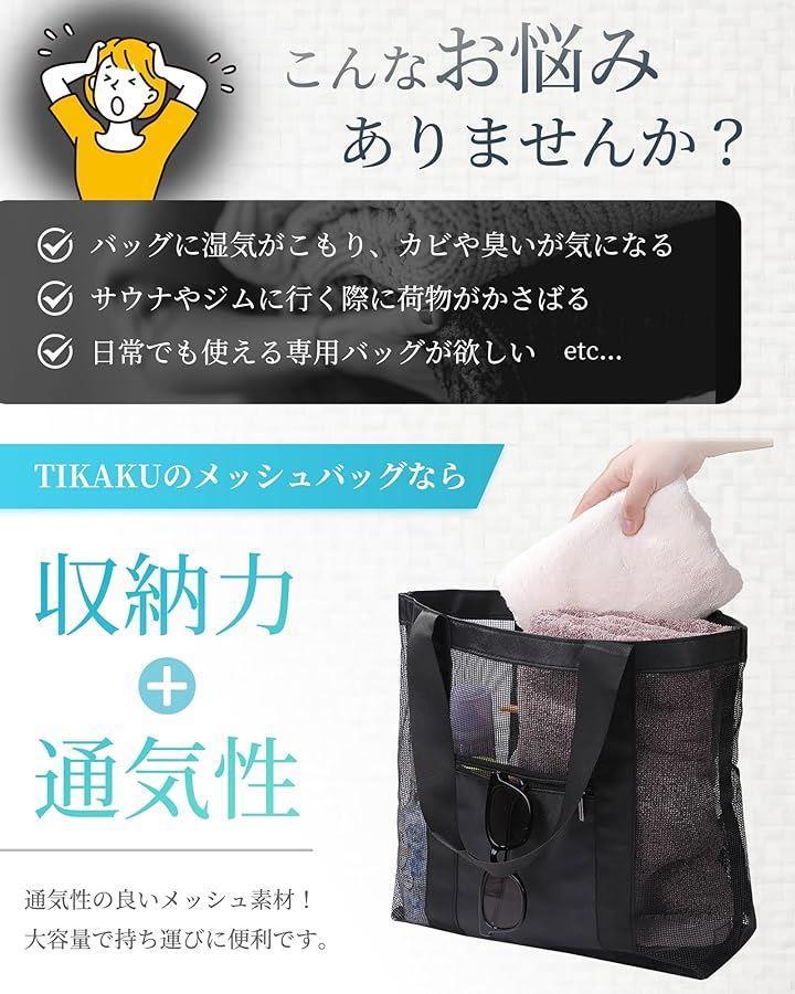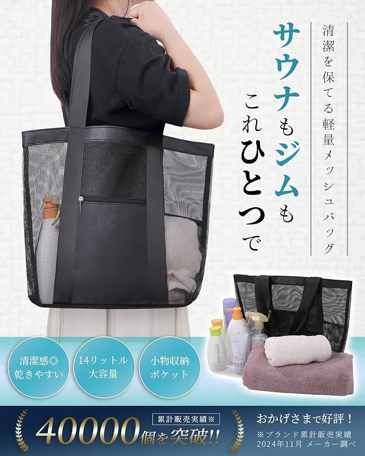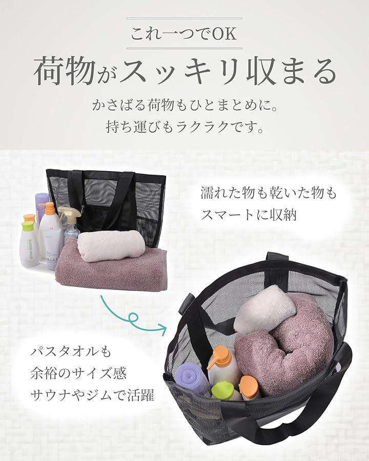 「シンプル&便利。多機能バッグ」サウナや温泉、プールやジムなど、気軽に使えるメッシュバッグです。
