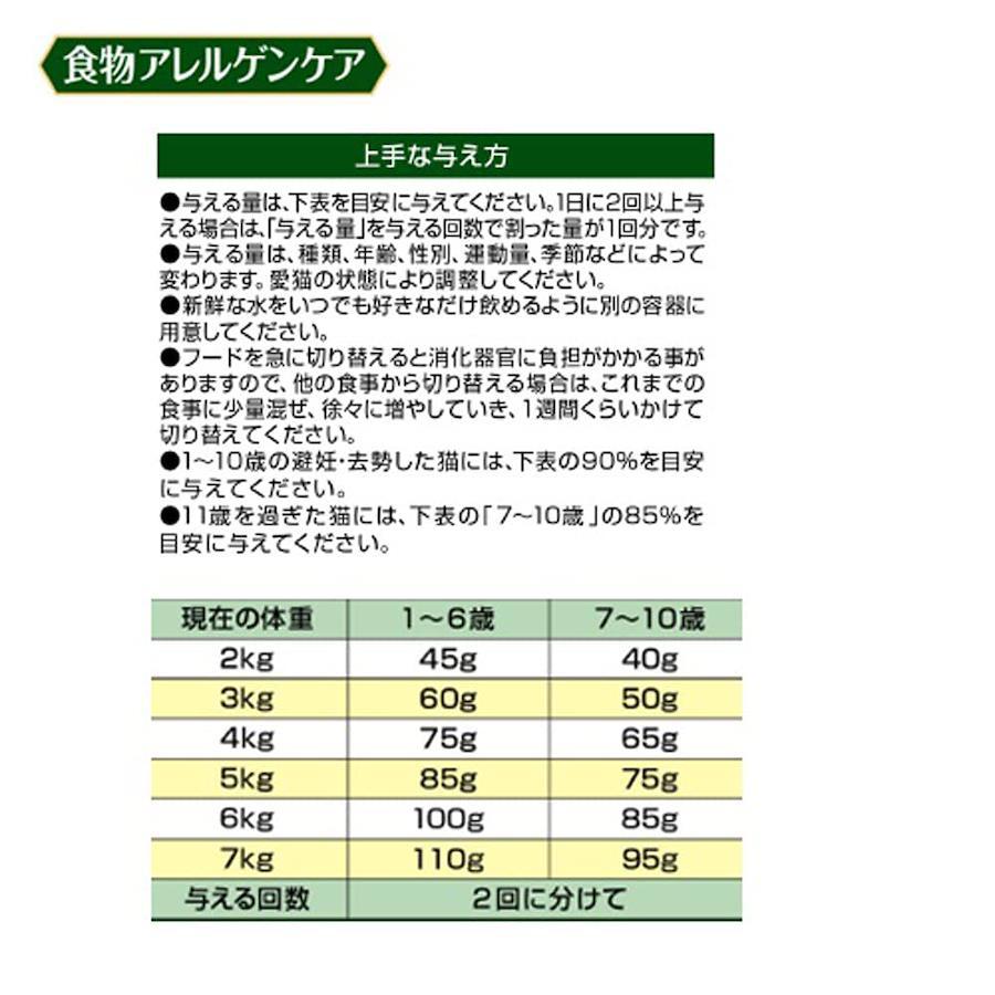 主たんぱく質源としてポーク、大豆、米を選択。DHA+EPA 2000mg/kg(標準値)含有、亜鉛アミノ酸複合体を配合。食物アレルギーの猫にも食事の楽しみをご提供します。