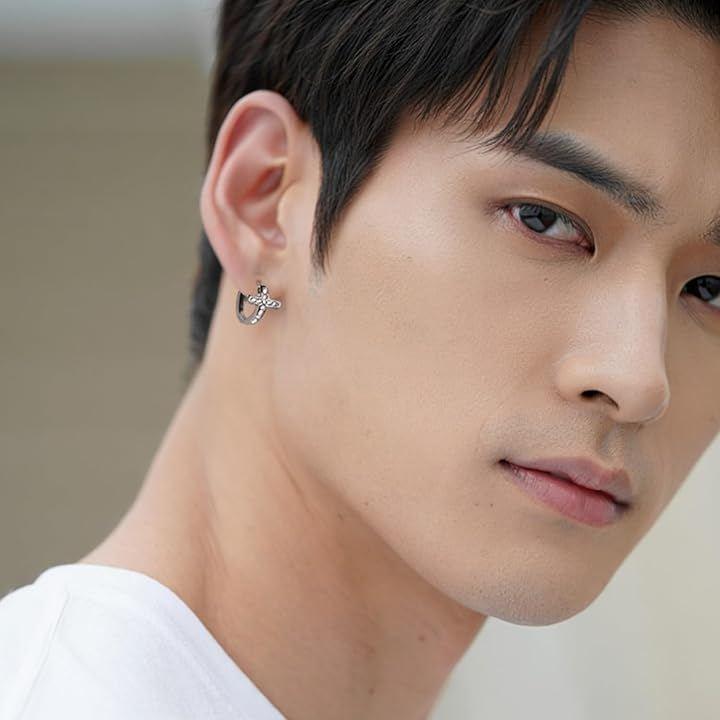 「クロスモチーフxフープピアスの融合」 定番のフープピアスにクロスのモチーフを重ねた存在感あるメンズピアス。