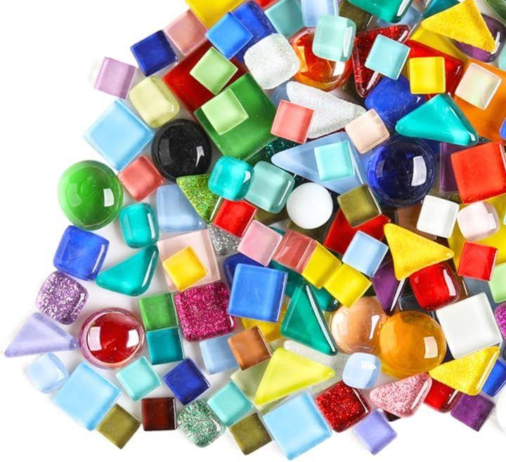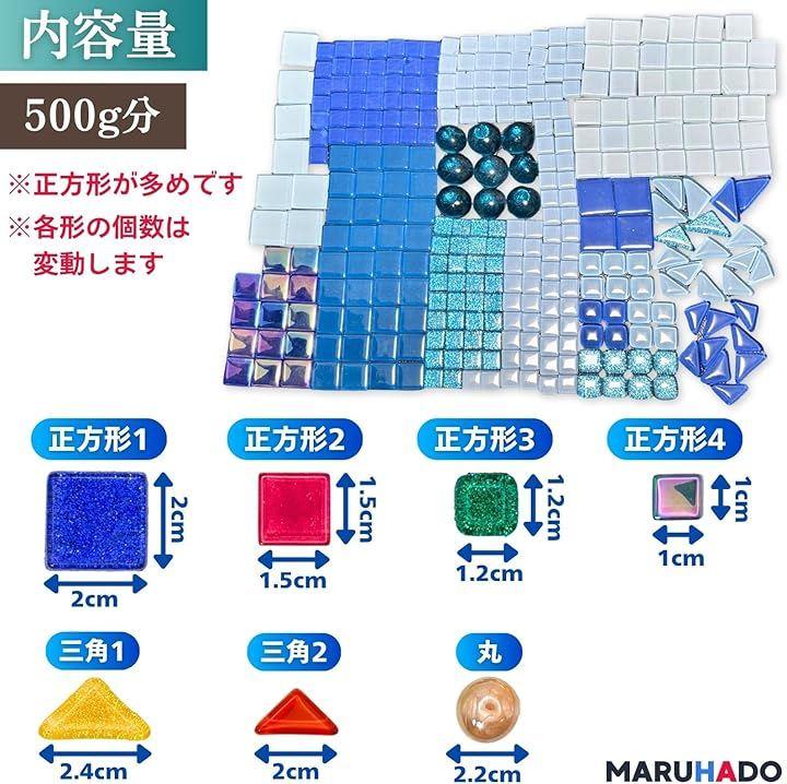 「商品内容」ガラスモザイクタイル 500g分 「材質」ガラス 「仕様」丸・四角・三角ランダム混合(四角多め) 「カラー」青・水色・空色・黄色・緑・青緑・桃色・赤・オレンジ・白・黒・各色混合 など多種ご用意しております。