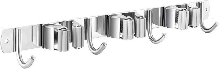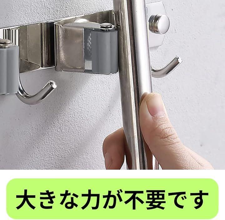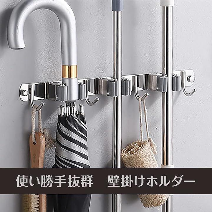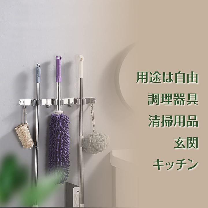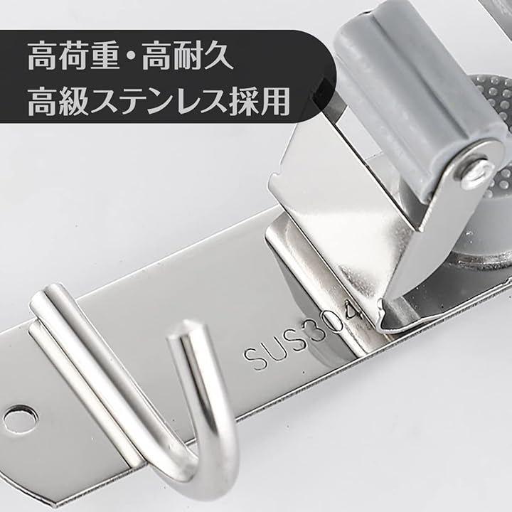 「使い勝手の良い仕様の壁掛けハンガー」ほうきやモップ、水切りワイパー、調理具、清掃用品など安定固定できる優れもの。
