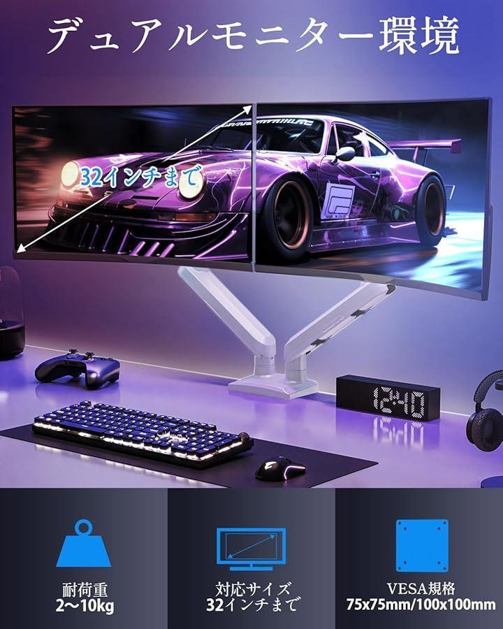 耐荷重は2~10kgで、32インチまでのモニターに対応。