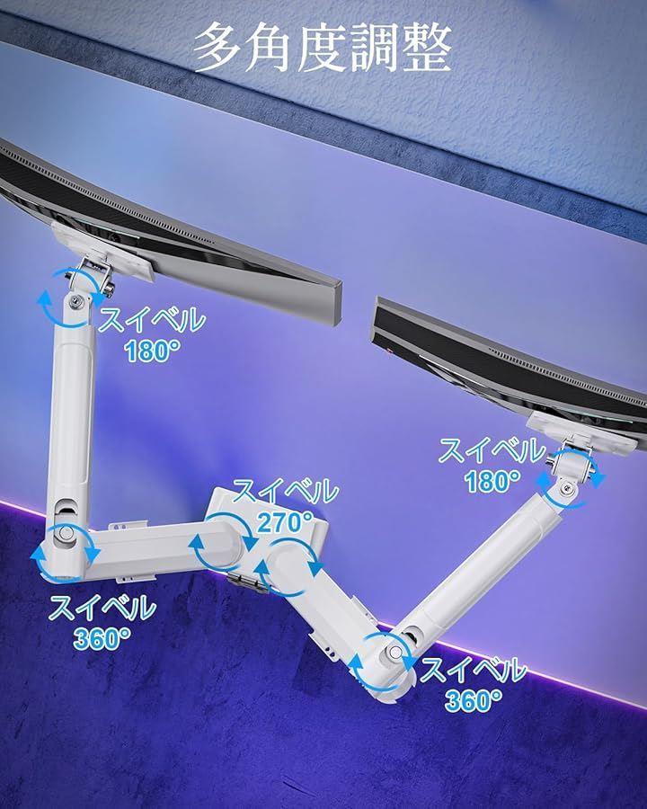 「2画面モニターアーム」軽い力で上下左右や前後に動かせ、液晶ディスプレイの位置を頻繁に変えたい人に向いています。