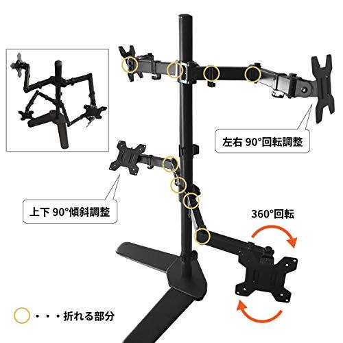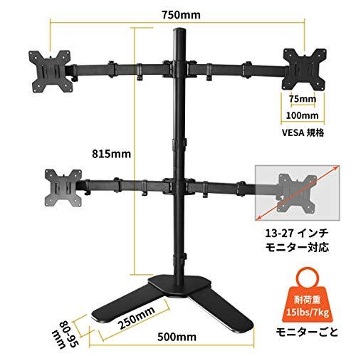 対応モニター数4台 対応モニタサイズ13?27インチ液晶モニタ VESA規格対応(ネジ穴距離)75×75mm, 100×100mm 支柱径40mm 耐荷重各アーム7kg 支柱高さ815mm 材質スチール アーム長さ750mm カラーブラック 上下調整角度+/-90度 塗装粉体塗装 左右調整角度+/-90度