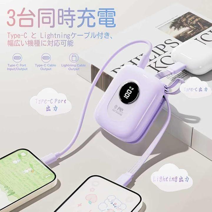 「3台同時充電ル& 22.5W急速充電」USB-Cポート、Type-CケーブルとiPhone端子ケーブルを装備し、最大3台のデバイスを同時に充電可能です。