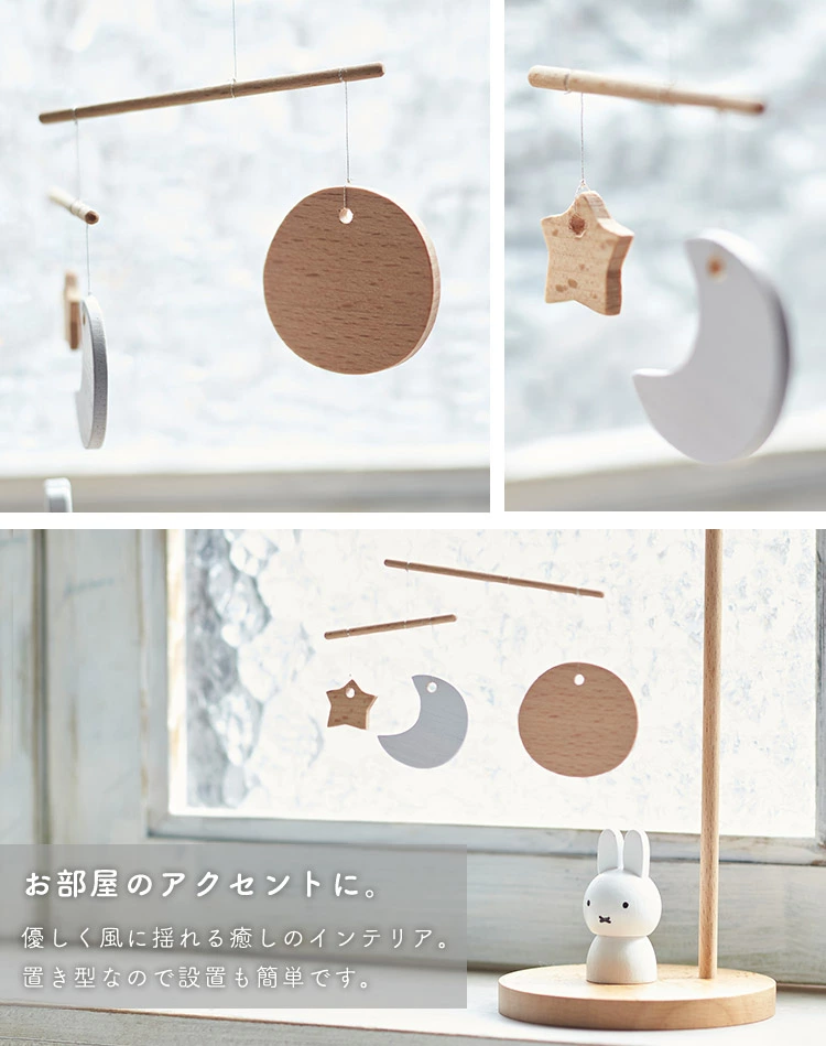 【モビール】日本で最も歴史の長い木のおもちゃメーカー「ニチガン」からシンプルなデザインと木の質感にこだわったミッフィー木製雑貨が登場。アートを見つめるミッフィーのデザインが可愛い、ナチュラルな木製の卓上モビールです。置き型なので設置も簡単、お家の玄関やリビングルームのアクセントにぴったり。かわいいパッケージ入りでプレゼントにもおすすめです!