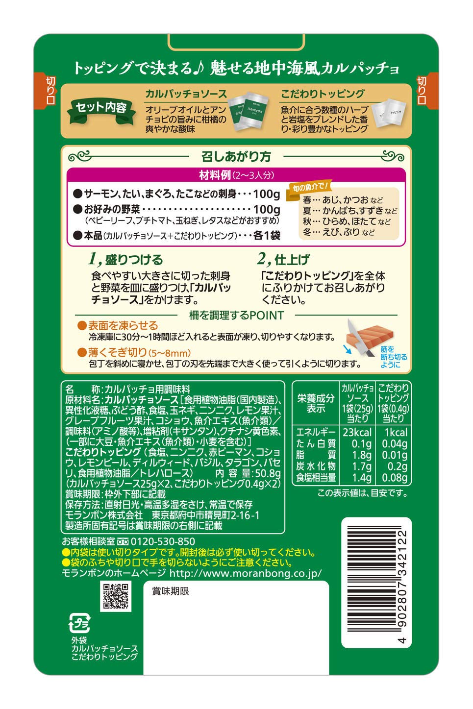 原材料:カルパッチョソース〔食用植物油脂(国内製造)、異性化液糖、ぶどう酢、食塩、玉ネギ、ニンニク、レモン果汁、グレープフルーツ果汁、コショウ、魚介エキス(魚介類)/調味料(アミノ酸等)、増粘剤(キサンタン)、クチナシ黄色素、(一部に大豆・魚介エキス(魚介類)・小麦を含む〕こだわりトッピング〔食塩、ニンニク、赤ピーマン、コショウ、レモンピール、ディルウィード、バジル、タラゴン、パセリ、食用植物油脂/トレハロース〕内容量:50.8g×10カロリー:23商品サイズ(高さx奥行x幅):8.8000000000000007cm×21.8cm×19.8cm【重要】メーカーによる商品リニューアルに伴いパッケージ(内容量も含む)変更が行われた場合、新パッケージでお届け致します事ご了承願います。