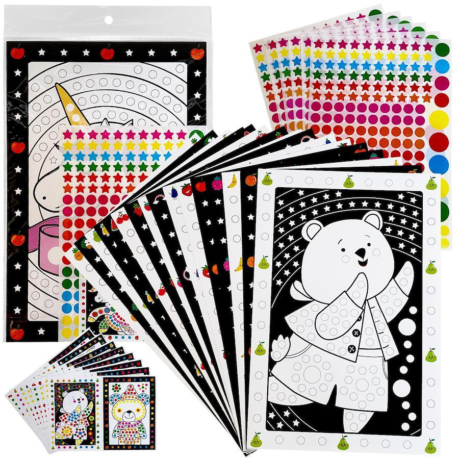 ?用紙がバラバラで貼りやすい! 冊子の場合、閉じている部分を片手でおさえなければならないので、両手を自由に使えません。なので子どもは「貼る」という作業に集中できません。 ?塗り絵可能 裏には塗り絵が可能になっているので1枚で2種類の取り組みが可能となっています。 ?用紙のサイズ A4サイズの大きさで縦30cm、横20cm ●シールサイズ:直径20ミリ 5色 10枚 直径10ミリ 6色 248枚 星シール 6色 120枚 ●台紙:2種類 ●見本:台紙のイラストは、恐竜や動植物、妖精などのお子さんが興味を持てる可愛らしいイラストになっています。 ?作業をより楽しくするための工夫を シールは、一玉ずつ切り離しておいた方が扱い易いのですが、手間だと思われる場合は、数個ずつの単位で切り離して、色毎にカップなどに分類して置かれると良いでしょう。 また、剥がしたシールの台紙を入れる容器(箱など)も用意してあげると良いでしょう。 ?楽しいが一番! 年齢にもよりますが、幼児は、〇に合わせて貼るという事は、なかなか難しいものです。 ですから 大きくずれても、重なっても、おおらかなお気持ちで、見守っていただき、お子さんにとって、シール貼りが楽しい時間となりますよう、願っております。 ※この商品は、モンテッソーリ教育の理念に基づいて製作されています。 ?【注意】シールが小さいのでお子様から目を離さぬようお願いいたします。シールを張る枠はシールがはみ出して、お子さんが「失敗した」と思わないように小さめとなっております。 ?『自己選択』『自己決定』こそ大切 モンテッソーリ教育は、『自己選択』『自己決定』を重視している教育法です。 そのため、「~しましょう」とか、「~色を貼りましょう」など という設問、指示はいりません。 何の色がいいのか、どこに貼るのか、お子さん自身に決めてもらいましょう。 ※「見本がないとできない!」と思う親御さんの為に一応見本は同封されています。